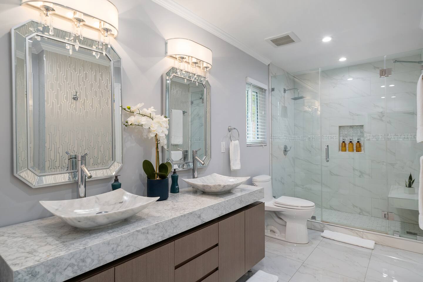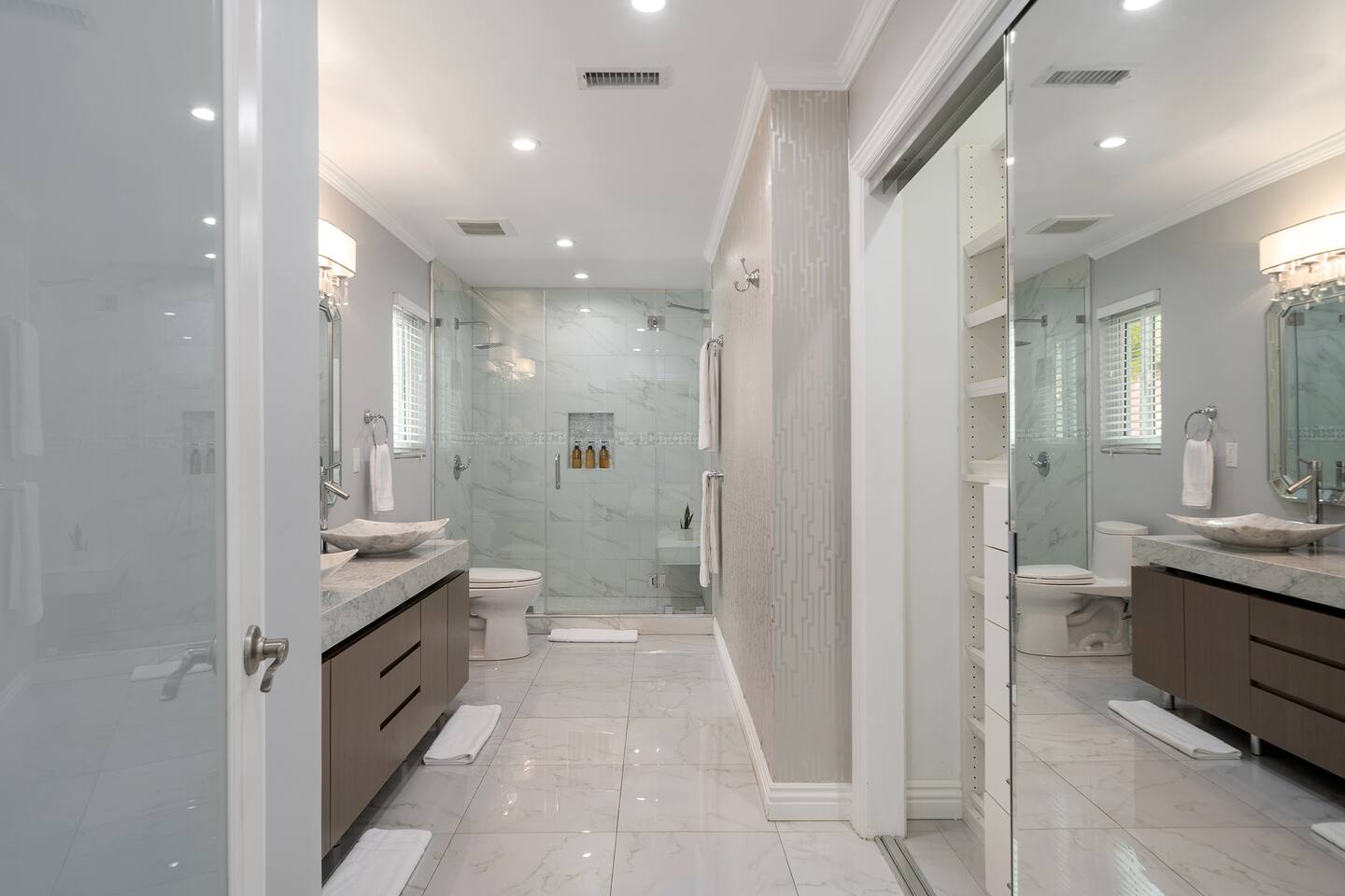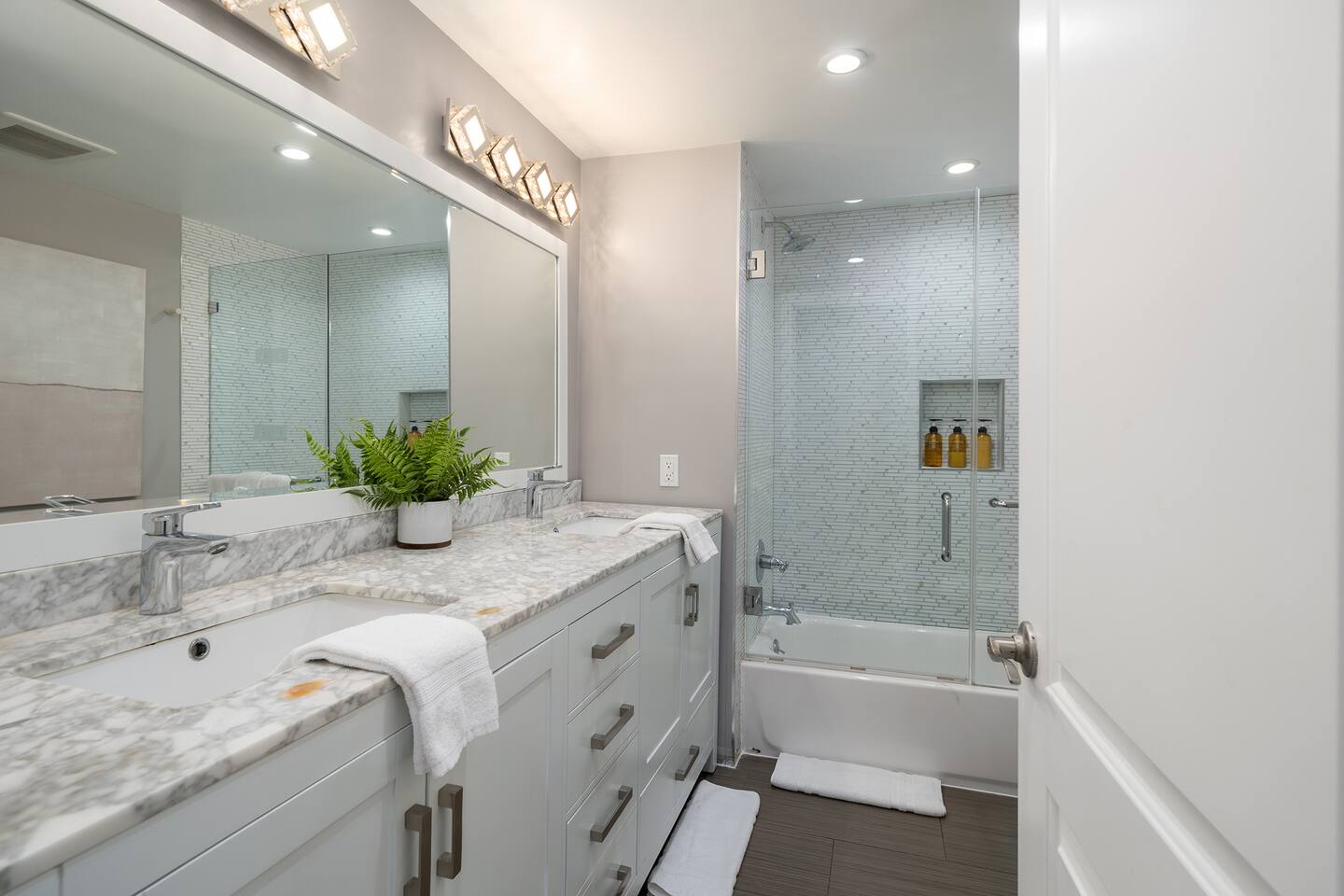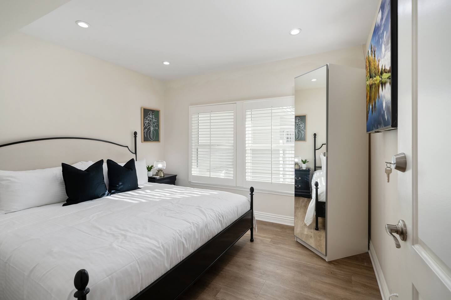 Family friendly spacious 5 bed/3 bath house has everything you need: fully equipped gourmet kitchen, brilliantly designed with quality in mind highlighted by a large center island, mini fridge, custom cut natural stone counters throughout, ample cabinet space and stainless-steel appliances. The master bedroom has a spacious en-suite bathroom with dual vanities, and a large shower. 2 car garage + large driveway which can accommodate up to 3 cars, plus plenty of parking on the street. Updated renovated bedrooms rooms are equipped with comfortable beds and cozy mattresses. Welcoming both business & leisure travelers from all around the world.