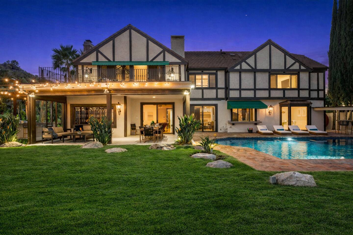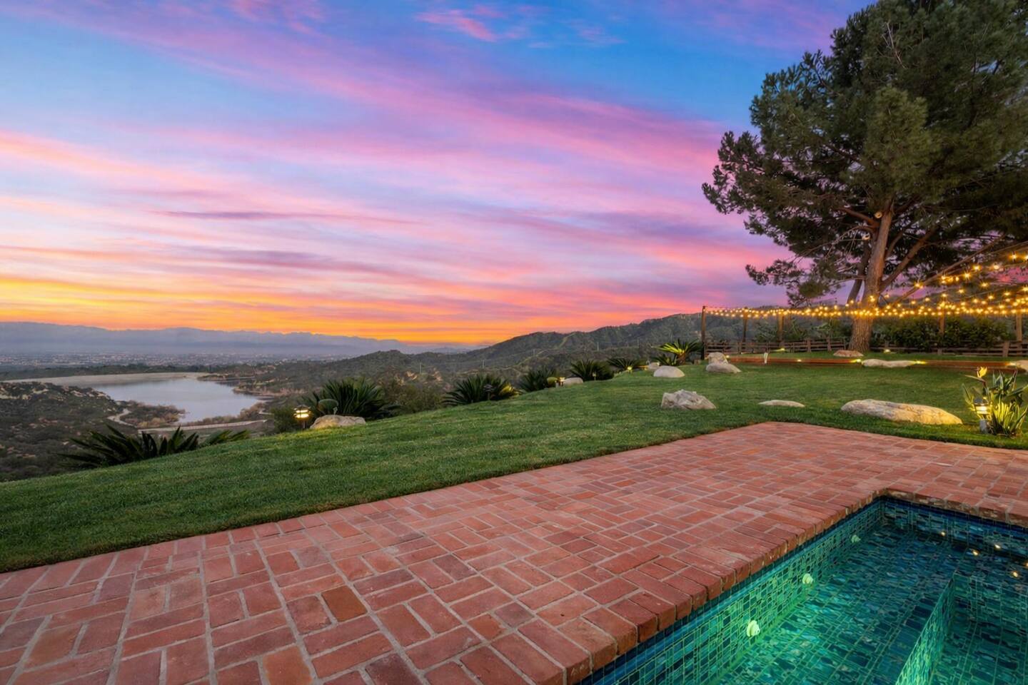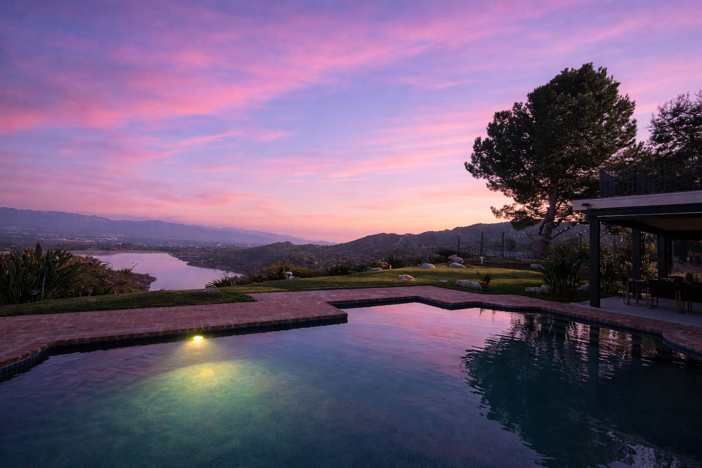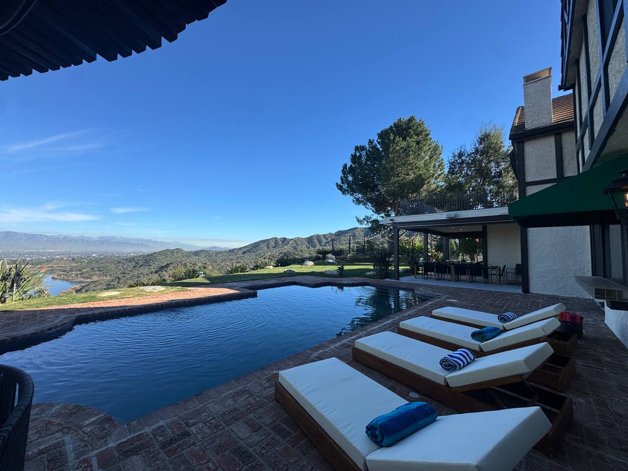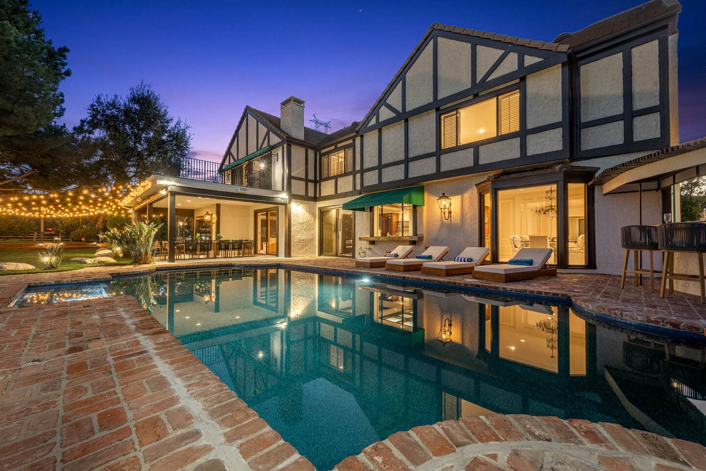 Beyond the gated entrance, the home welcomes you with a beautiful foyer that opens into an elegant formal living room, thoughtfully upgraded with modern furnishings and new window treatments. Adjacent is a brand-new dining room seating eight, framed by bay windows with views of the pool and the lake beyond. The kitchen, while not remodeled, is charming, fully stocked, and includes a casual breakfast area. A second living space functions as an entertainer’s den, featuring a pool table, full bar, large TV, and ample seating. This flexible layout is ideal for gatherings or relaxed evenings in. The home is especially well-suited for families and multi-generational stays, offering a first-floor bedroom with a queen bed, private ensuite bathroom, and separate exterior entrance—perfect for guests who prefer to avoid stairs. A three-car garage adds convenience. Upstairs are three additional bedrooms, including a spacious suite with a king bed, TV, and ensuite bath; a versatile office/guest room with a queen sleeper sofa; and an expansive primary retreat. The primary suite features an Alaskan king bed, sitting area, fireplace, dual ensuite bathrooms, dual walk-in closets, and a large private balcony with seating overlooking the lake. Outdoors, the property truly shines. The rare lake views—virtually impossible to find without direct lake frontage—set the backdrop for a resort-style yard with a large pool, spa, private sauna, expansive lawn, string lighting, outdoor dining for large groups, and two built-in bar areas with BBQ stations. It’s an exceptional setting for entertaining, relaxing, and enjoying one of the best views in Encino. Pet-friendly, private, and ideal for memorable stays, this home offers a rare combination of space, views, and lifestyle.