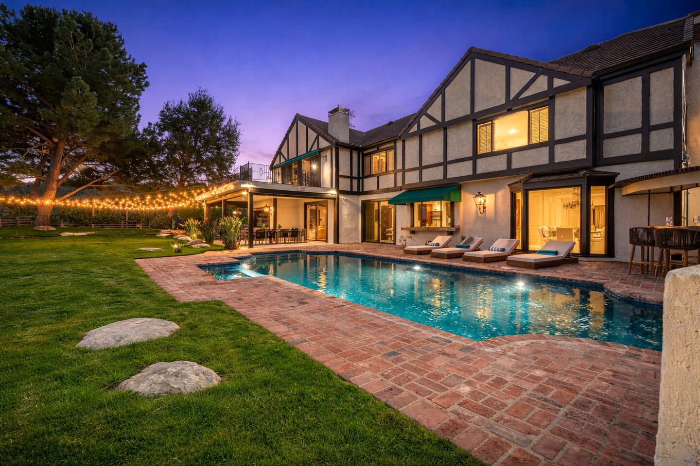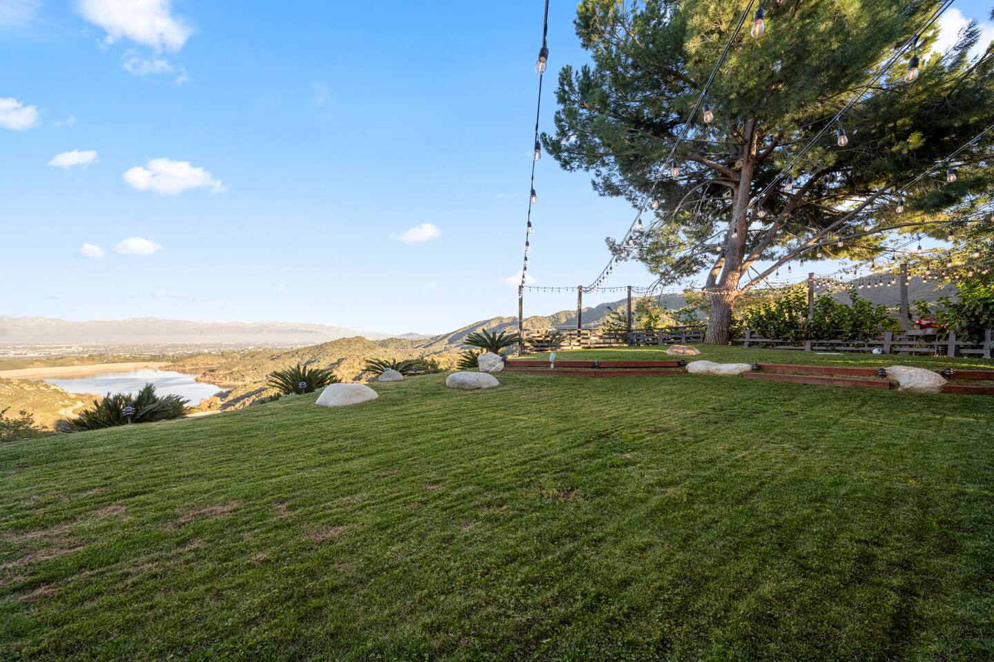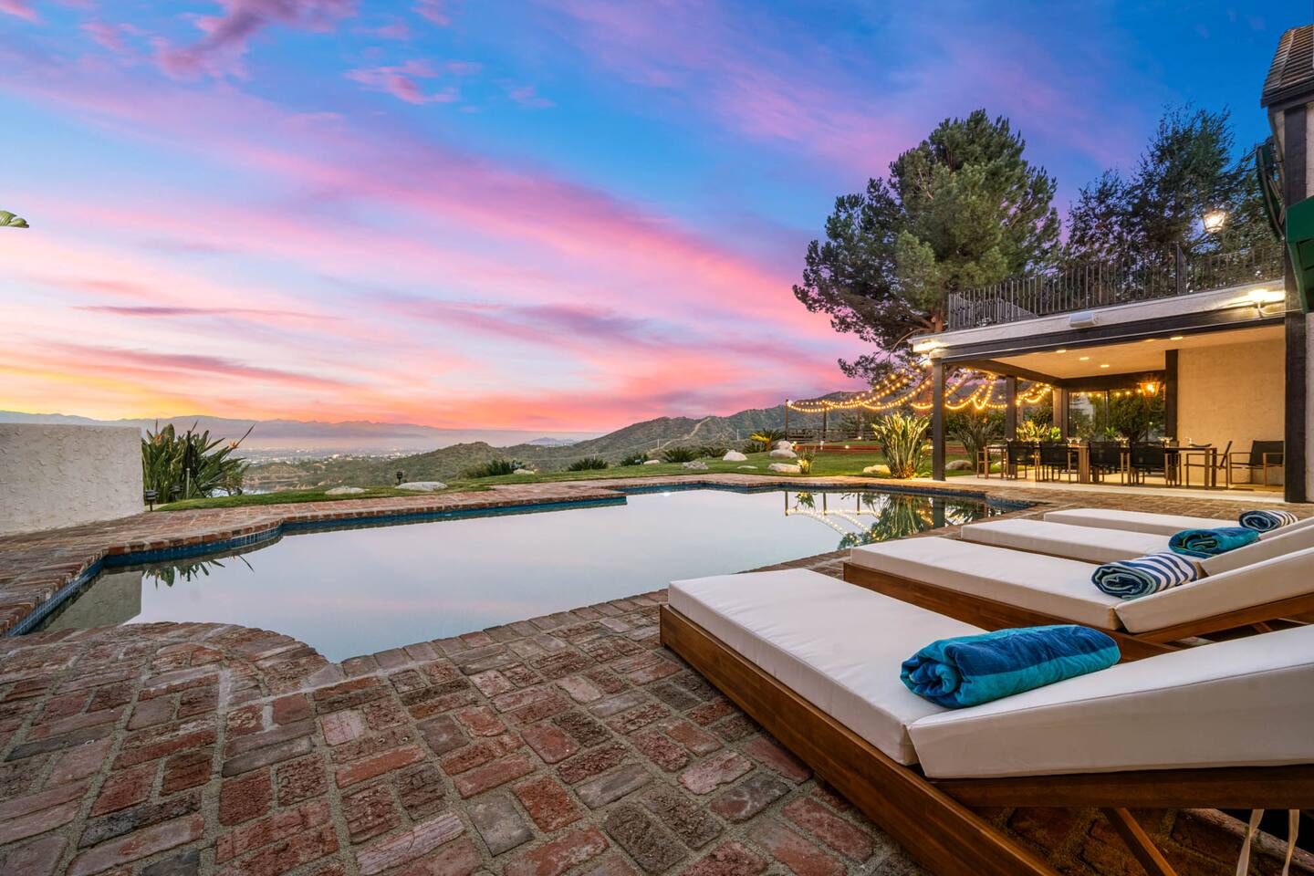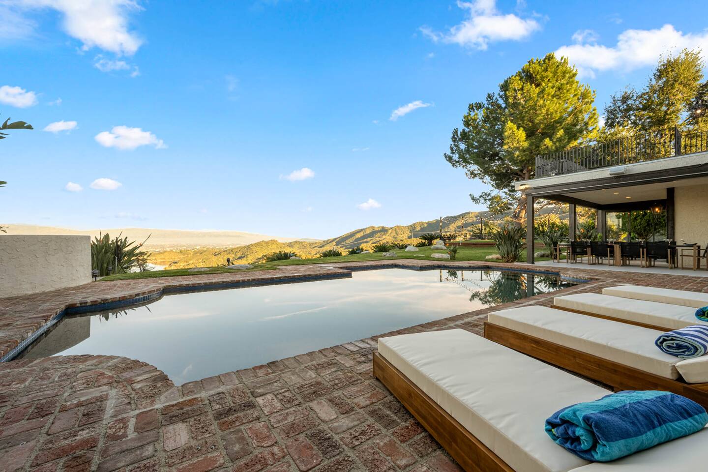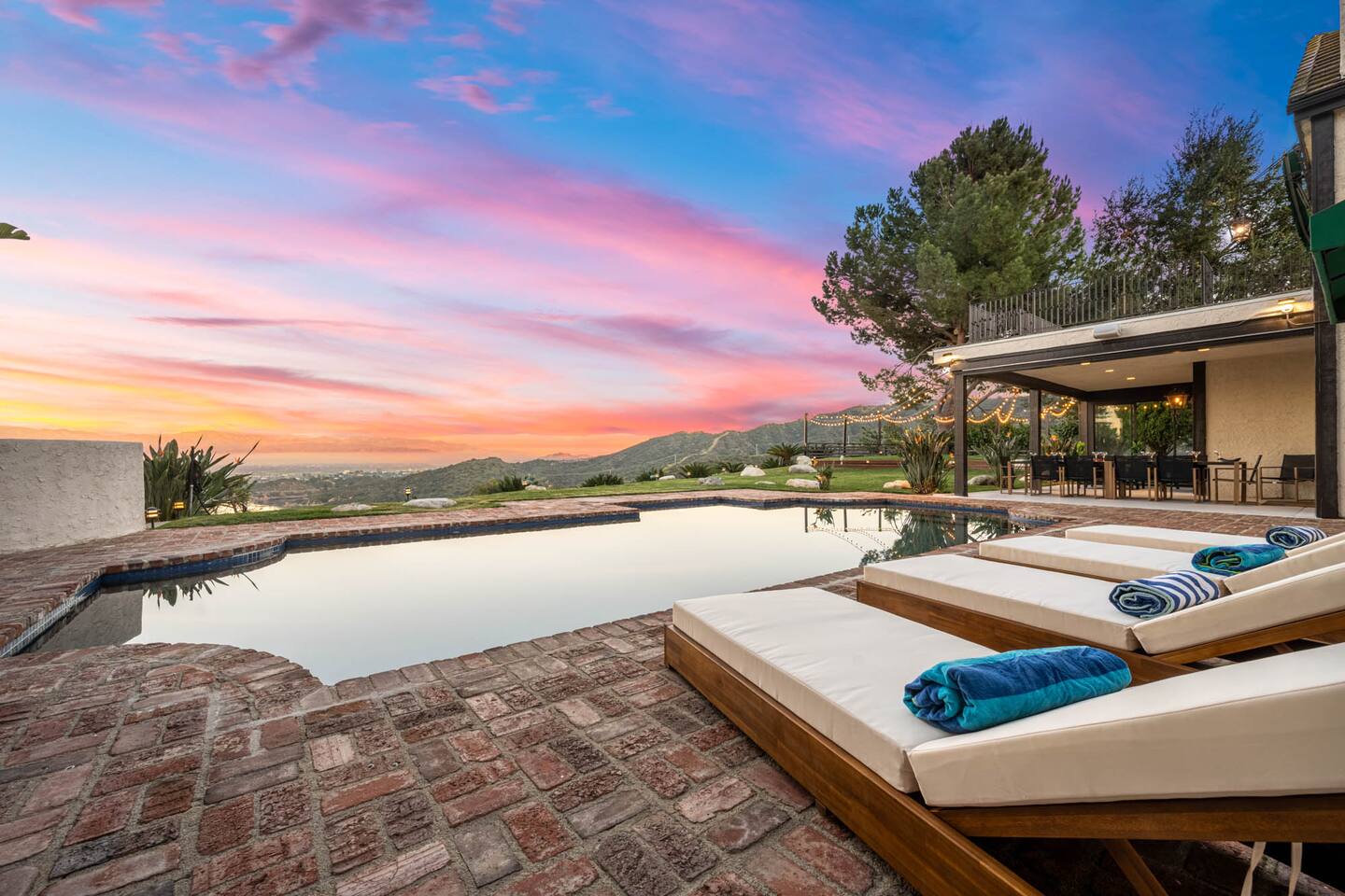 Beyond the gated entrance, the home welcomes you with a beautiful foyer that opens into an elegant formal living room, thoughtfully upgraded with modern furnishings and new window treatments. Adjacent is a brand-new dining room seating eight, framed by bay windows with views of the pool and the lake beyond. The kitchen, while not remodeled, is charming, fully stocked, and includes a casual breakfast area. A second living space functions as an entertainer’s den, featuring a pool table, full bar, large TV, and ample seating. This flexible layout is ideal for gatherings or relaxed evenings in. The home is especially well-suited for families and multi-generational stays, offering a first-floor bedroom with a queen bed, private ensuite bathroom, and separate exterior entrance—perfect for guests who prefer to avoid stairs. A three-car garage adds convenience. Upstairs are three additional bedrooms, including a spacious suite with a king bed, TV, and ensuite bath; a versatile office/guest room with a queen sleeper sofa; and an expansive primary retreat. The primary suite features an Alaskan king bed, sitting area, fireplace, dual ensuite bathrooms, dual walk-in closets, and a large private balcony with seating overlooking the lake. Outdoors, the property truly shines. The rare lake views—virtually impossible to find without direct lake frontage—set the backdrop for a resort-style yard with a large pool, spa, private sauna, expansive lawn, string lighting, outdoor dining for large groups, and two built-in bar areas with BBQ stations. It’s an exceptional setting for entertaining, relaxing, and enjoying one of the best views in Encino. Pet-friendly, private, and ideal for memorable stays, this home offers a rare combination of space, views, and lifestyle.