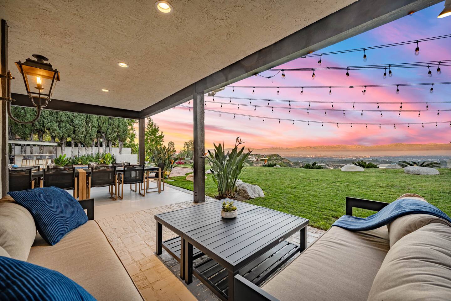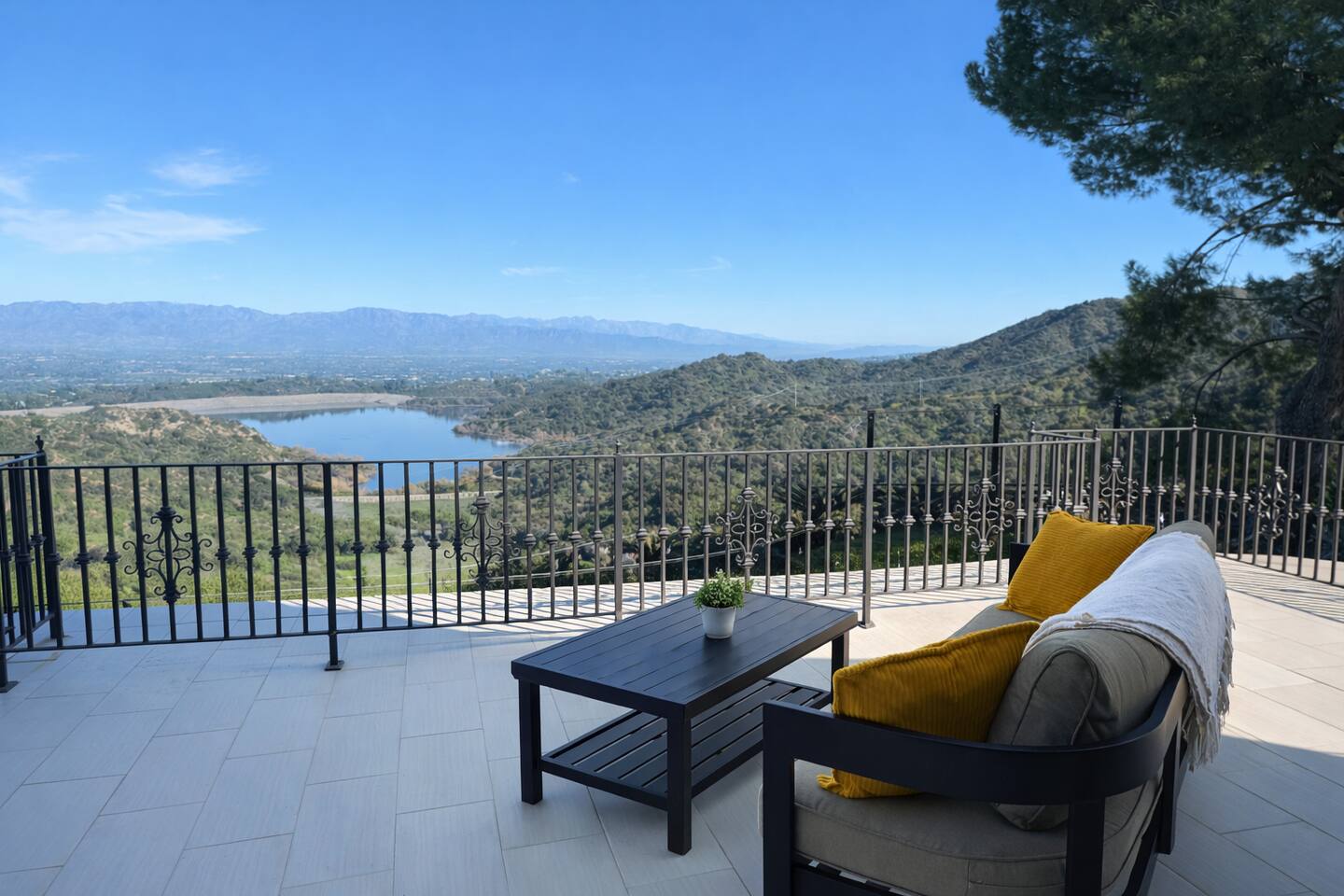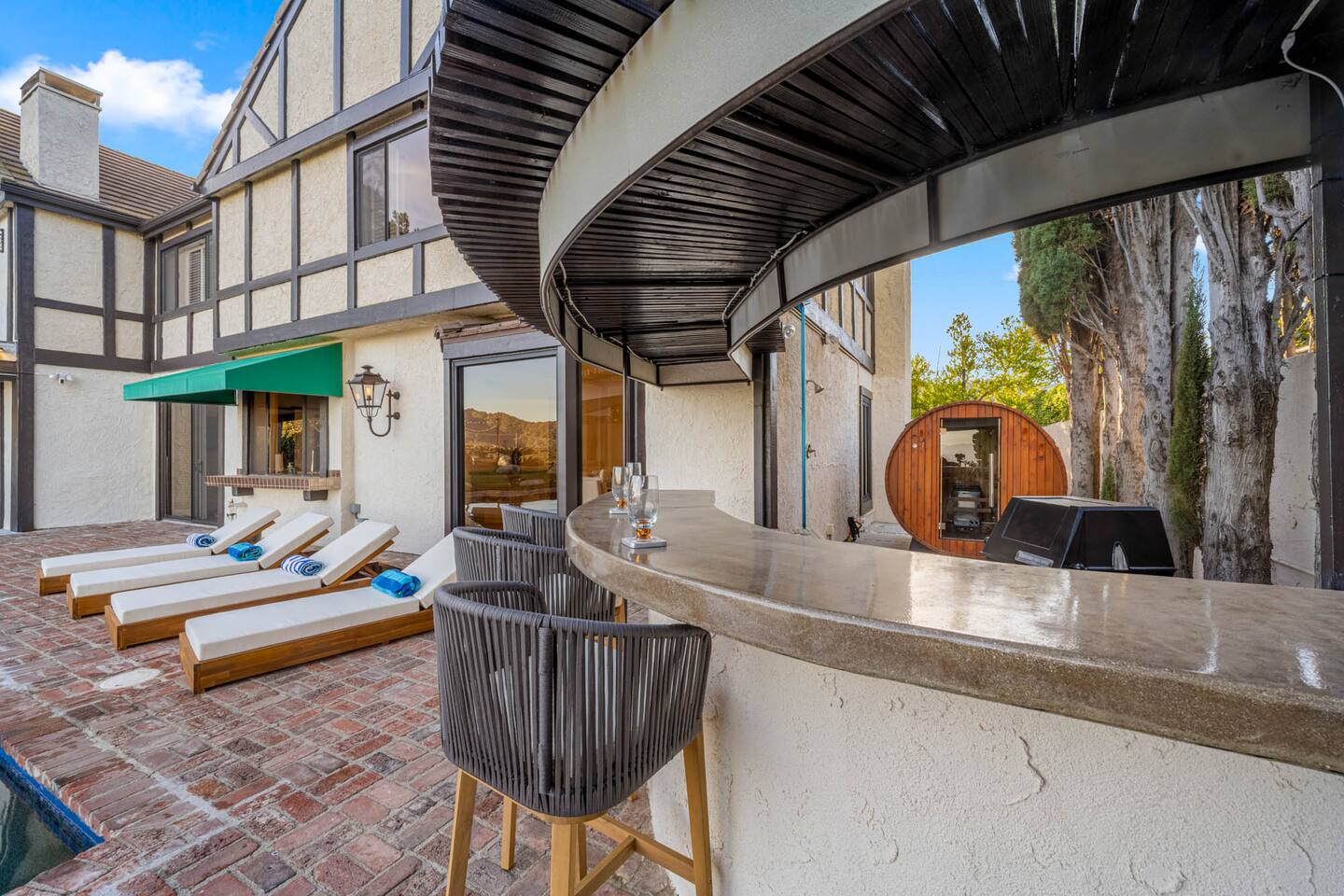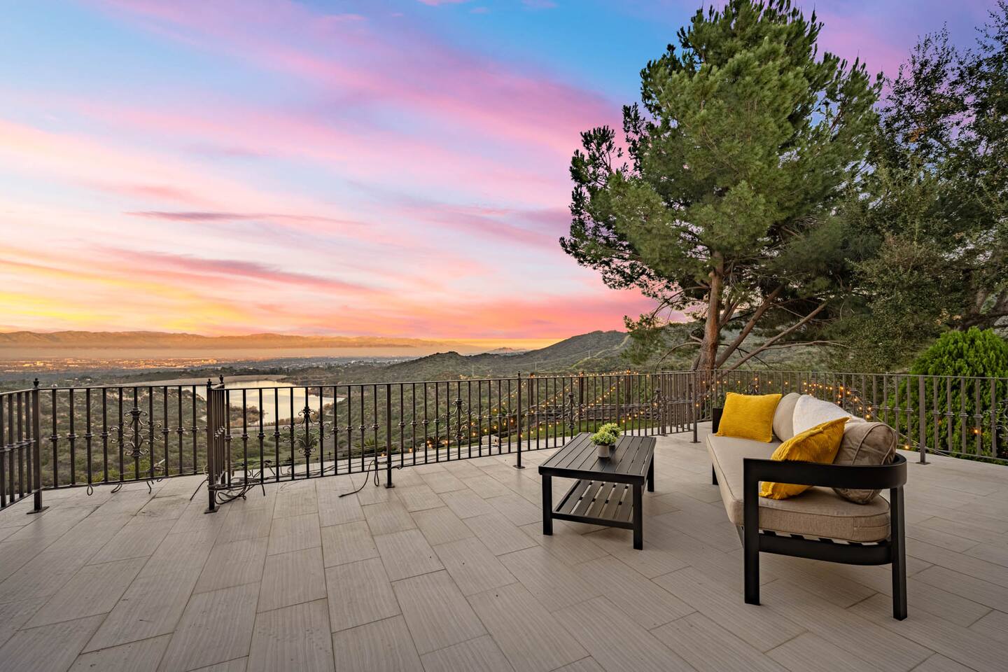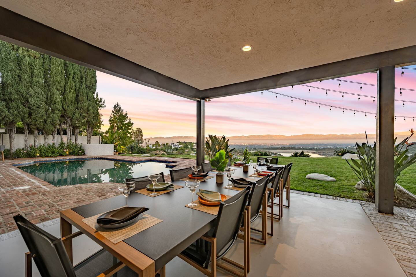 Beyond the gated entrance, the home welcomes you with a beautiful foyer that opens into an elegant formal living room, thoughtfully upgraded with modern furnishings and new window treatments. Adjacent is a brand-new dining room seating eight, framed by bay windows with views of the pool and the lake beyond. The kitchen, while not remodeled, is charming, fully stocked, and includes a casual breakfast area. A second living space functions as an entertainer’s den, featuring a pool table, full bar, large TV, and ample seating. This flexible layout is ideal for gatherings or relaxed evenings in. The home is especially well-suited for families and multi-generational stays, offering a first-floor bedroom with a queen bed, private ensuite bathroom, and separate exterior entrance—perfect for guests who prefer to avoid stairs. A three-car garage adds convenience. Upstairs are three additional bedrooms, including a spacious suite with a king bed, TV, and ensuite bath; a versatile office/guest room with a queen sleeper sofa; and an expansive primary retreat. The primary suite features an Alaskan king bed, sitting area, fireplace, dual ensuite bathrooms, dual walk-in closets, and a large private balcony with seating overlooking the lake. Outdoors, the property truly shines. The rare lake views—virtually impossible to find without direct lake frontage—set the backdrop for a resort-style yard with a large pool, spa, private sauna, expansive lawn, string lighting, outdoor dining for large groups, and two built-in bar areas with BBQ stations. It’s an exceptional setting for entertaining, relaxing, and enjoying one of the best views in Encino. Pet-friendly, private, and ideal for memorable stays, this home offers a rare combination of space, views, and lifestyle.