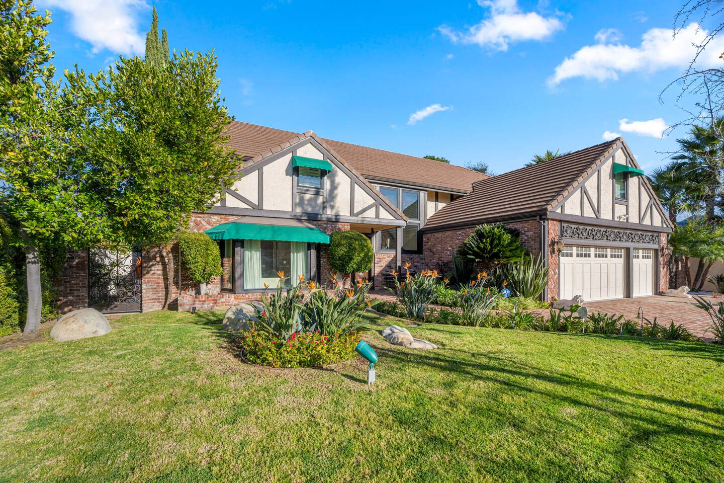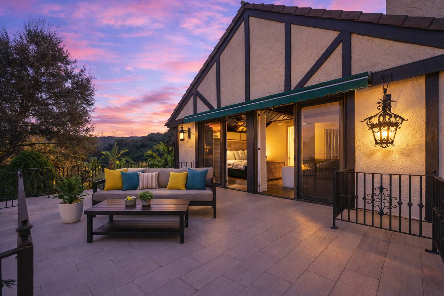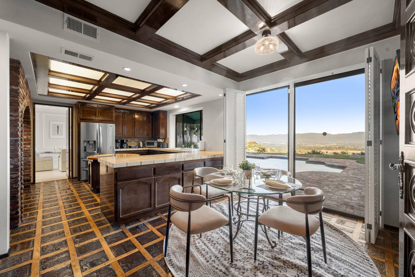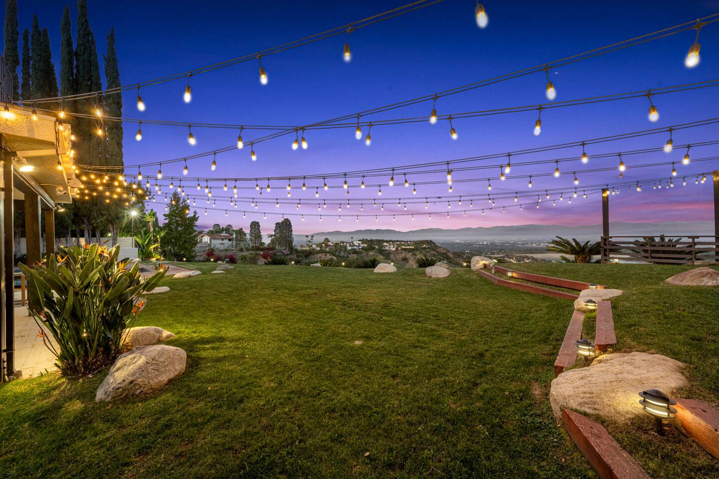 Beyond the gated entrance, the home welcomes you with a beautiful foyer that opens into an elegant formal living room, thoughtfully upgraded with modern furnishings and new window treatments. Adjacent is a brand-new dining room seating eight, framed by bay windows with views of the pool and the lake beyond. The kitchen, while not remodeled, is charming, fully stocked, and includes a casual breakfast area. A second living space functions as an entertainer’s den, featuring a pool table, full bar, large TV, and ample seating. This flexible layout is ideal for gatherings or relaxed evenings in. The home is especially well-suited for families and multi-generational stays, offering a first-floor bedroom with a queen bed, private ensuite bathroom, and separate exterior entrance—perfect for guests who prefer to avoid stairs. A three-car garage adds convenience. Upstairs are three additional bedrooms, including a spacious suite with a king bed, TV, and ensuite bath; a versatile office/guest room with a queen sleeper sofa; and an expansive primary retreat. The primary suite features an Alaskan king bed, sitting area, fireplace, dual ensuite bathrooms, dual walk-in closets, and a large private balcony with seating overlooking the lake. Outdoors, the property truly shines. The rare lake views—virtually impossible to find without direct lake frontage—set the backdrop for a resort-style yard with a large pool, spa, private sauna, expansive lawn, string lighting, outdoor dining for large groups, and two built-in bar areas with BBQ stations. It’s an exceptional setting for entertaining, relaxing, and enjoying one of the best views in Encino. Pet-friendly, private, and ideal for memorable stays, this home offers a rare combination of space, views, and lifestyle.