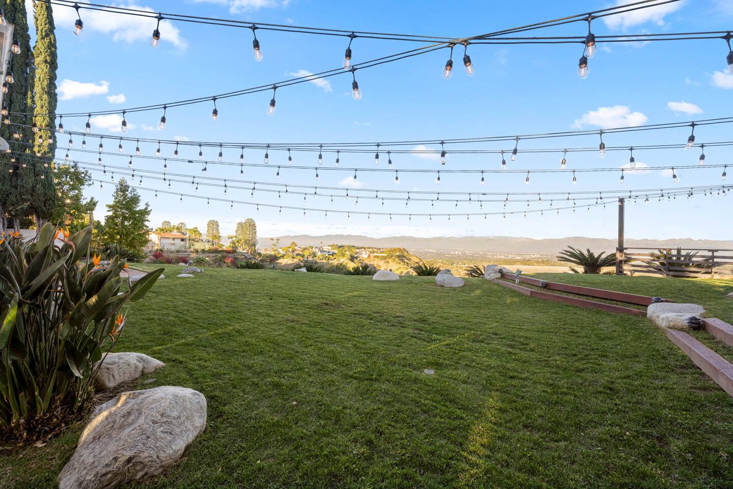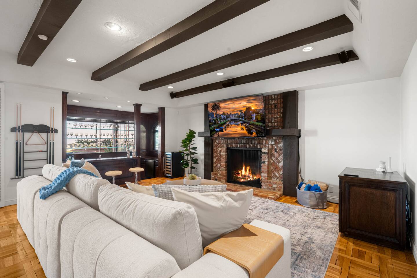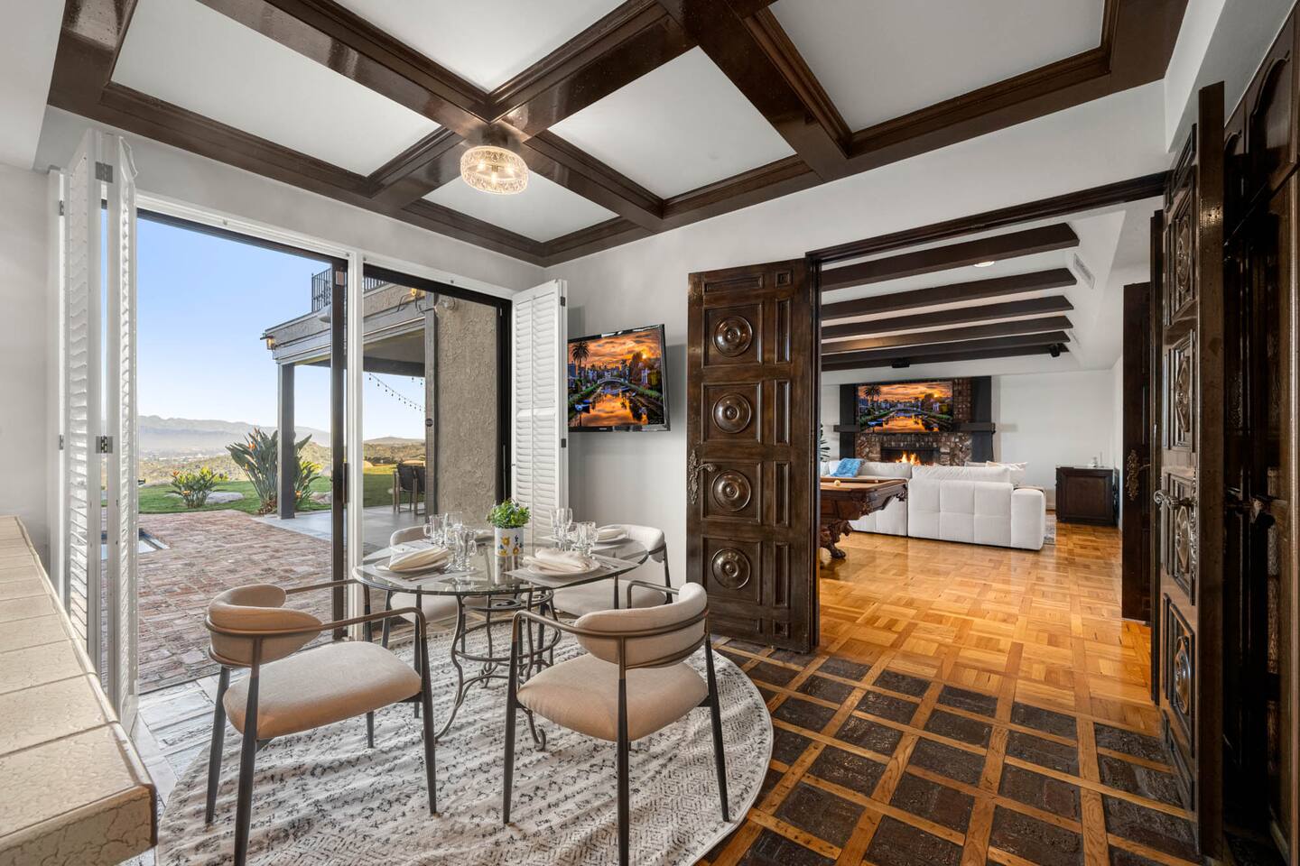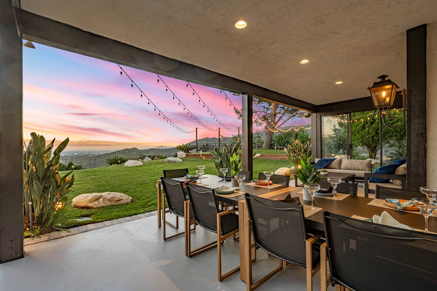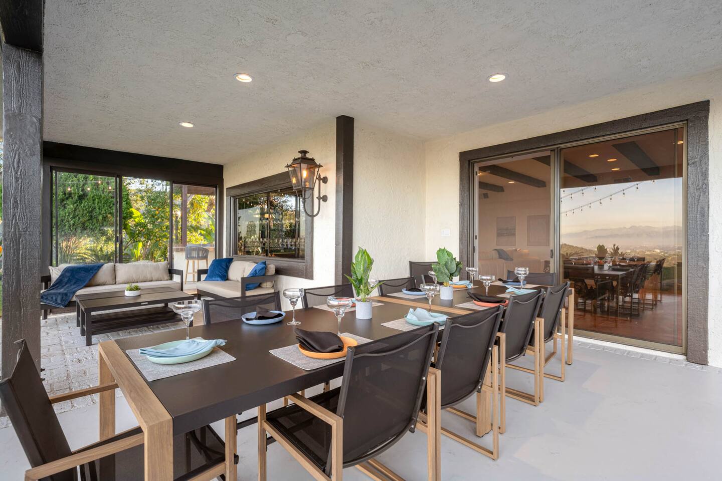Beyond the gated entrance, the home welcomes you with a beautiful foyer that opens into an elegant formal living room, thoughtfully upgraded with modern furnishings and new window treatments. Adjacent is a brand-new dining room seating eight, framed by bay windows with views of the pool and the lake beyond. The kitchen, while not remodeled, is charming, fully stocked, and includes a casual breakfast area. A second living space functions as an entertainer’s den, featuring a pool table, full bar, large TV, and ample seating. This flexible layout is ideal for gatherings or relaxed evenings in. The home is especially well-suited for families and multi-generational stays, offering a first-floor bedroom with a queen bed, private ensuite bathroom, and separate exterior entrance—perfect for guests who prefer to avoid stairs. A three-car garage adds convenience. Upstairs are three additional bedrooms, including a spacious suite with a king bed, TV, and ensuite bath; a versatile office/guest room with a queen sleeper sofa; and an expansive primary retreat. The primary suite features an Alaskan king bed, sitting area, fireplace, dual ensuite bathrooms, dual walk-in closets, and a large private balcony with seating overlooking the lake. Outdoors, the property truly shines. The rare lake views—virtually impossible to find without direct lake frontage—set the backdrop for a resort-style yard with a large pool, spa, private sauna, expansive lawn, string lighting, outdoor dining for large groups, and two built-in bar areas with BBQ stations. It’s an exceptional setting for entertaining, relaxing, and enjoying one of the best views in Encino. Pet-friendly, private, and ideal for memorable stays, this home offers a rare combination of space, views, and lifestyle.