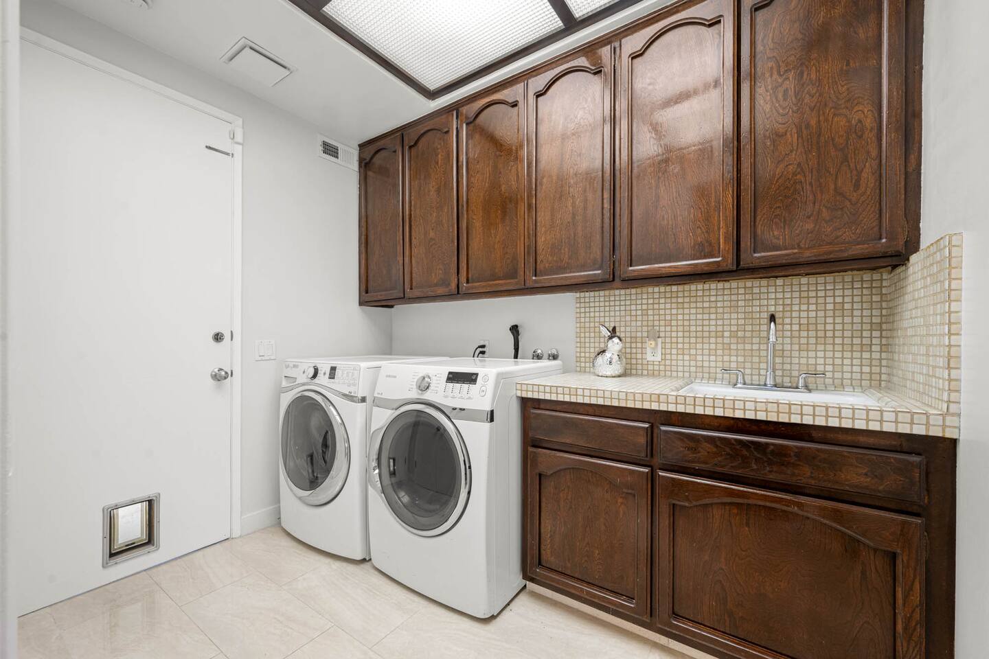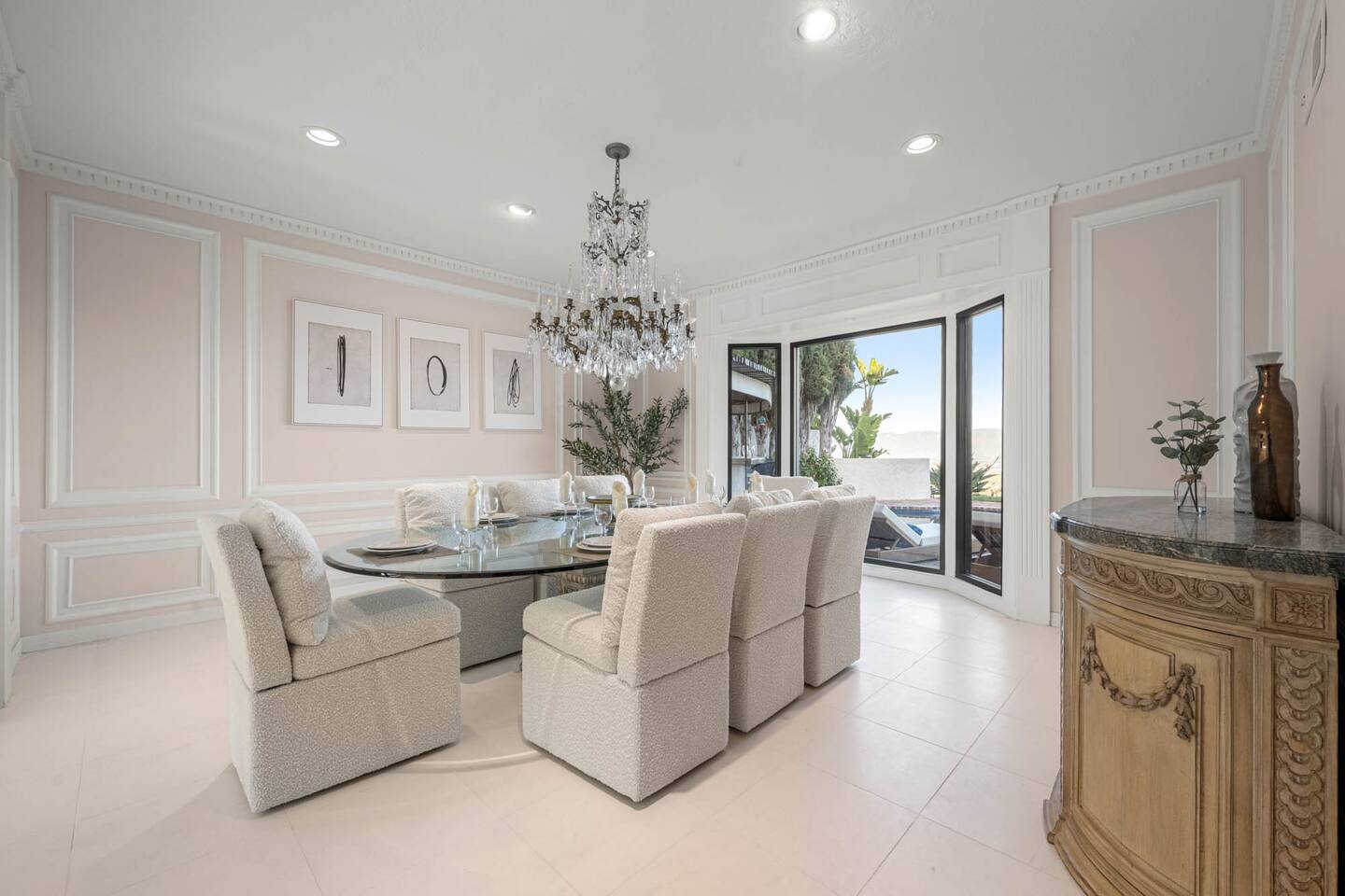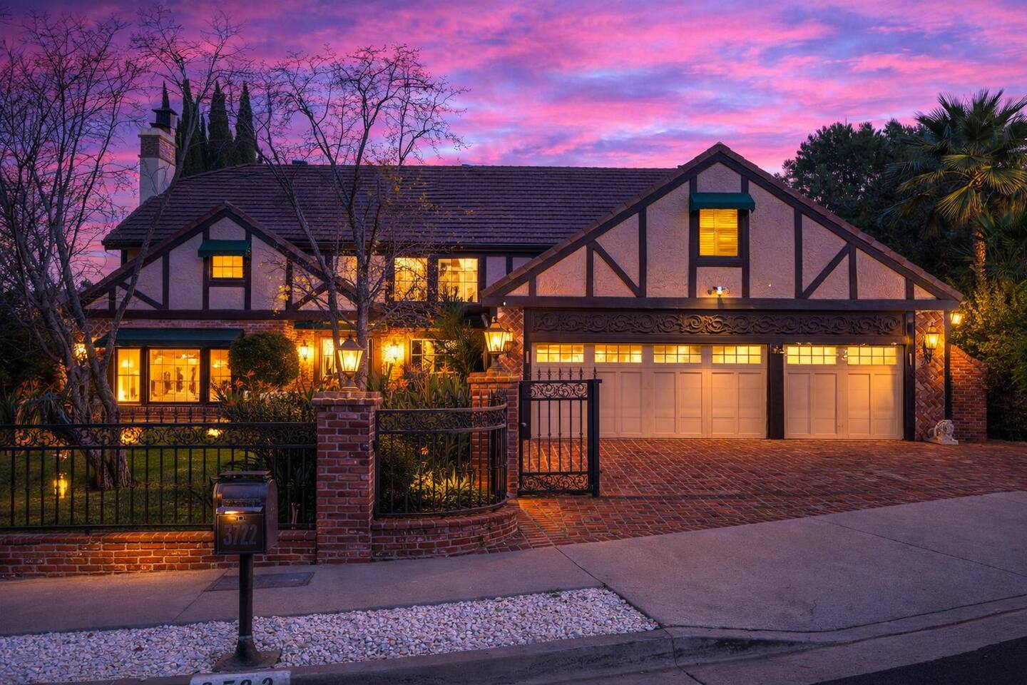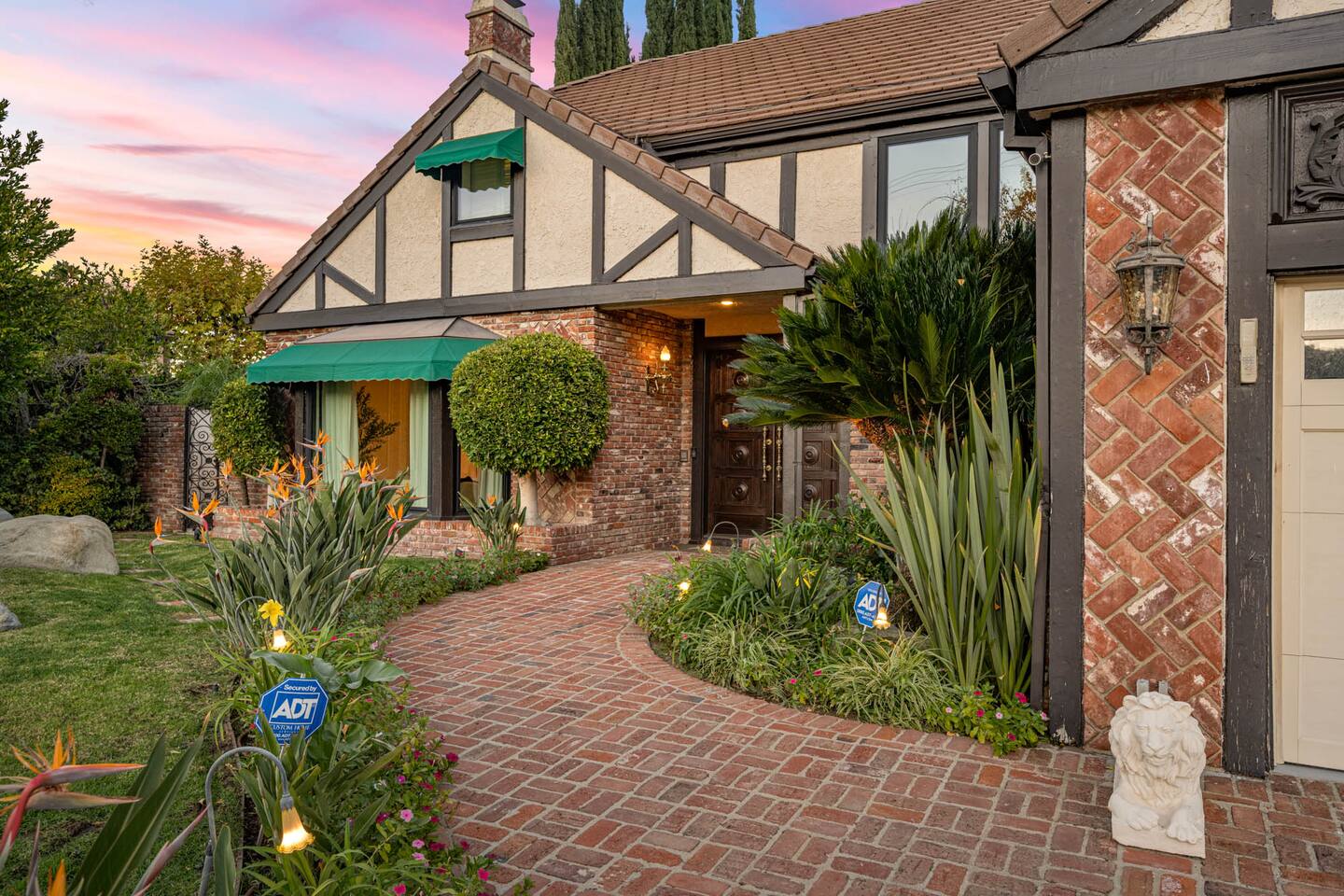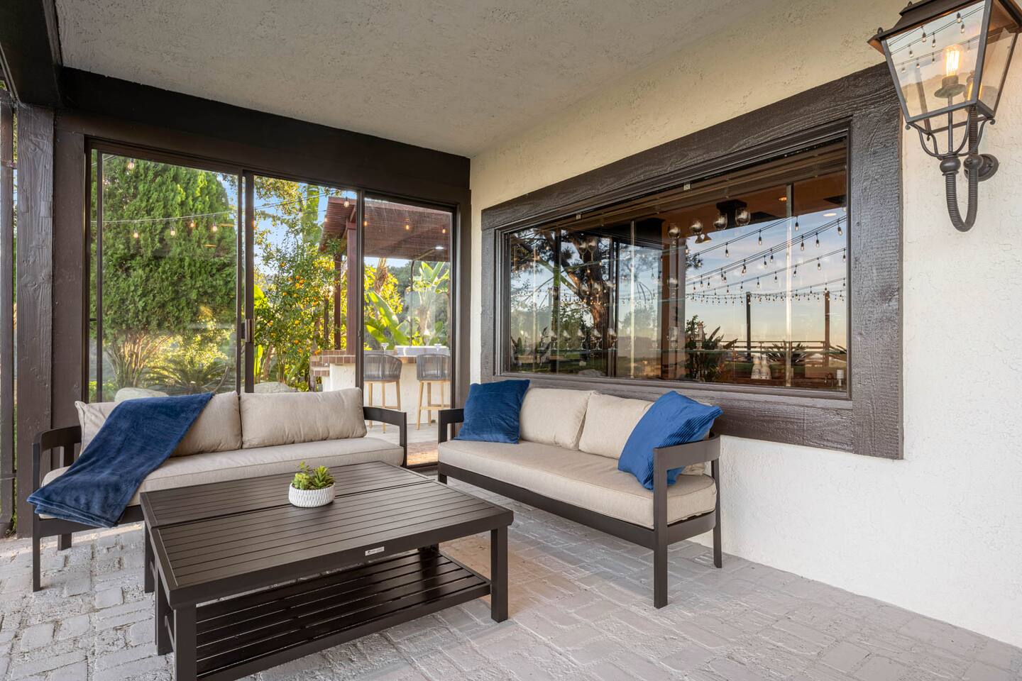 Beyond the gated entrance, the home welcomes you with a beautiful foyer that opens into an elegant formal living room, thoughtfully upgraded with modern furnishings and new window treatments. Adjacent is a brand-new dining room seating eight, framed by bay windows with views of the pool and the lake beyond. The kitchen, while not remodeled, is charming, fully stocked, and includes a casual breakfast area. A second living space functions as an entertainer’s den, featuring a pool table, full bar, large TV, and ample seating. This flexible layout is ideal for gatherings or relaxed evenings in. The home is especially well-suited for families and multi-generational stays, offering a first-floor bedroom with a queen bed, private ensuite bathroom, and separate exterior entrance—perfect for guests who prefer to avoid stairs. A three-car garage adds convenience. Upstairs are three additional bedrooms, including a spacious suite with a king bed, TV, and ensuite bath; a versatile office/guest room with a queen sleeper sofa; and an expansive primary retreat. The primary suite features an Alaskan king bed, sitting area, fireplace, dual ensuite bathrooms, dual walk-in closets, and a large private balcony with seating overlooking the lake. Outdoors, the property truly shines. The rare lake views—virtually impossible to find without direct lake frontage—set the backdrop for a resort-style yard with a large pool, spa, private sauna, expansive lawn, string lighting, outdoor dining for large groups, and two built-in bar areas with BBQ stations. It’s an exceptional setting for entertaining, relaxing, and enjoying one of the best views in Encino. Pet-friendly, private, and ideal for memorable stays, this home offers a rare combination of space, views, and lifestyle.