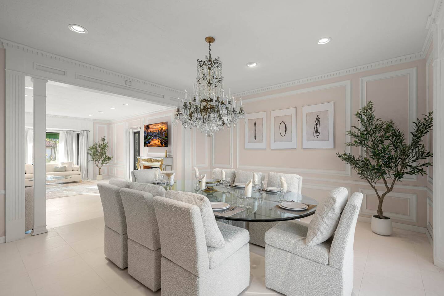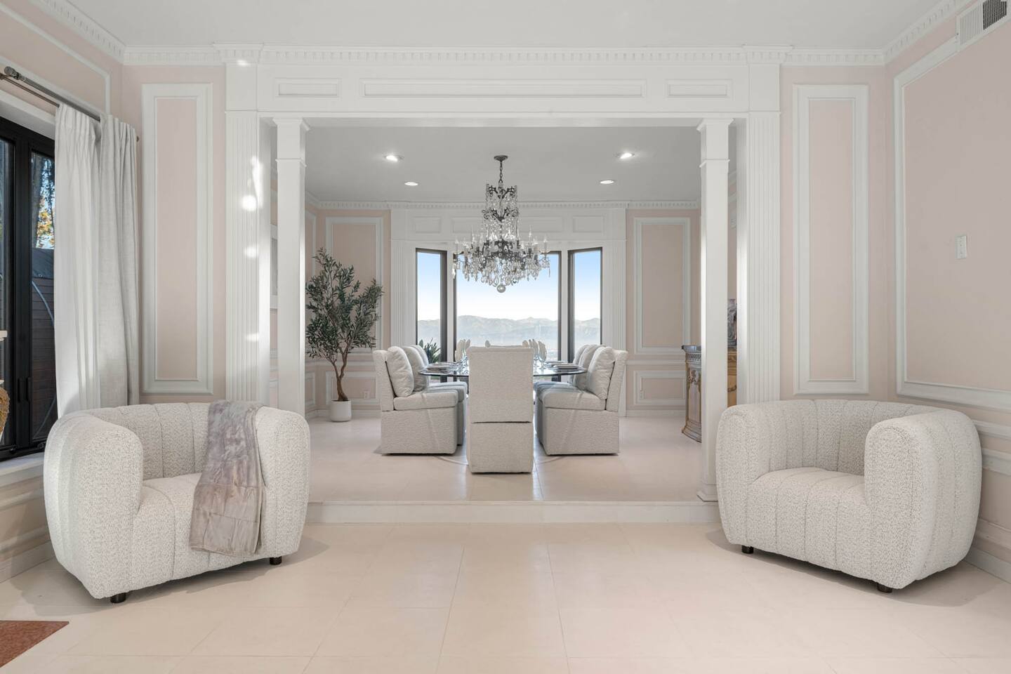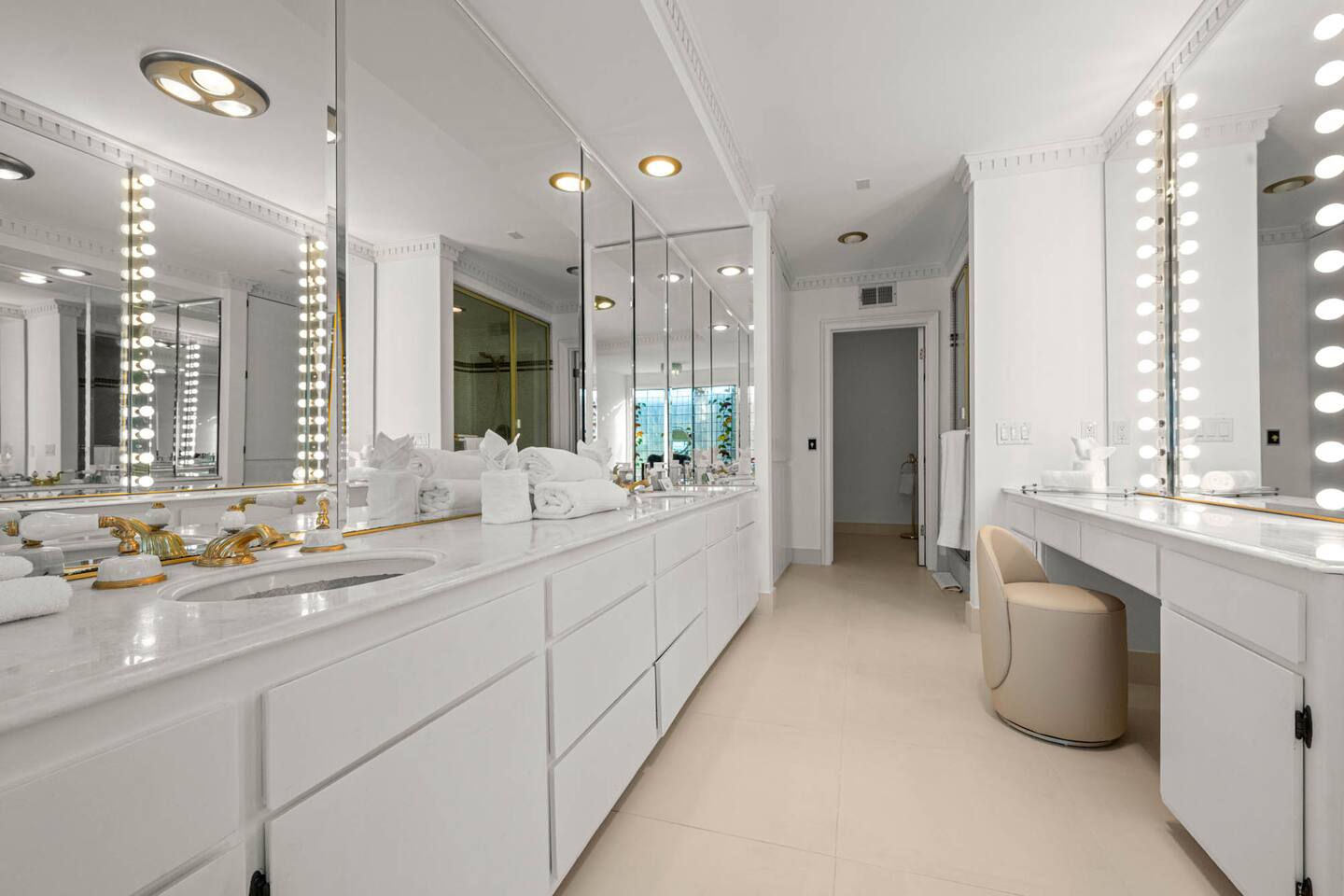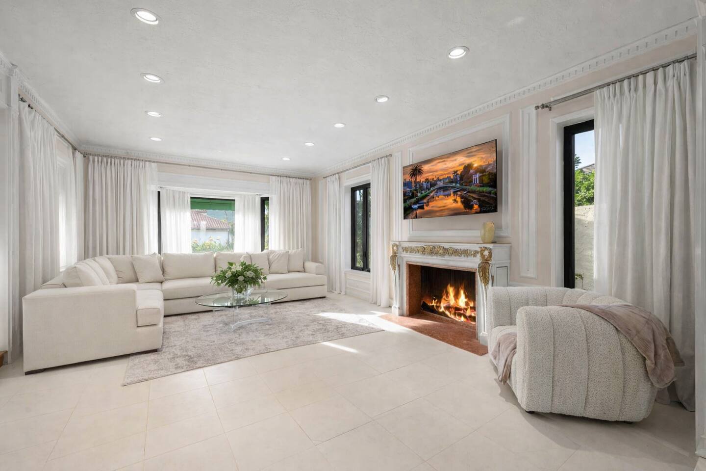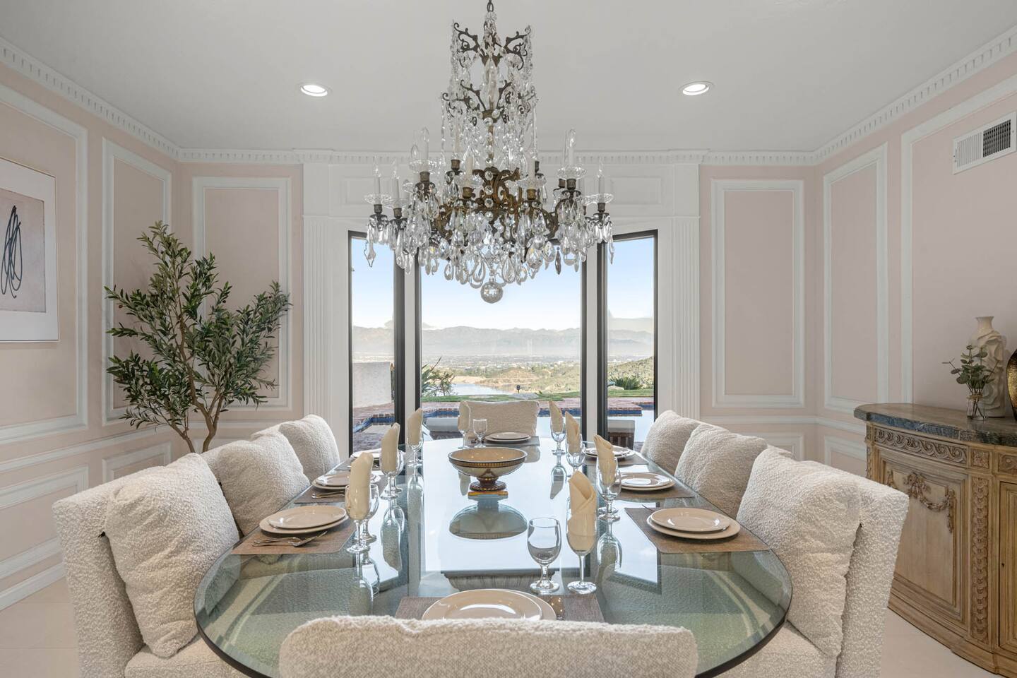 Beyond the gated entrance, the home welcomes you with a beautiful foyer that opens into an elegant formal living room, thoughtfully upgraded with modern furnishings and new window treatments. Adjacent is a brand-new dining room seating eight, framed by bay windows with views of the pool and the lake beyond. The kitchen, while not remodeled, is charming, fully stocked, and includes a casual breakfast area. A second living space functions as an entertainer’s den, featuring a pool table, full bar, large TV, and ample seating. This flexible layout is ideal for gatherings or relaxed evenings in. The home is especially well-suited for families and multi-generational stays, offering a first-floor bedroom with a queen bed, private ensuite bathroom, and separate exterior entrance—perfect for guests who prefer to avoid stairs. A three-car garage adds convenience. Upstairs are three additional bedrooms, including a spacious suite with a king bed, TV, and ensuite bath; a versatile office/guest room with a queen sleeper sofa; and an expansive primary retreat. The primary suite features an Alaskan king bed, sitting area, fireplace, dual ensuite bathrooms, dual walk-in closets, and a large private balcony with seating overlooking the lake. Outdoors, the property truly shines. The rare lake views—virtually impossible to find without direct lake frontage—set the backdrop for a resort-style yard with a large pool, spa, private sauna, expansive lawn, string lighting, outdoor dining for large groups, and two built-in bar areas with BBQ stations. It’s an exceptional setting for entertaining, relaxing, and enjoying one of the best views in Encino. Pet-friendly, private, and ideal for memorable stays, this home offers a rare combination of space, views, and lifestyle.