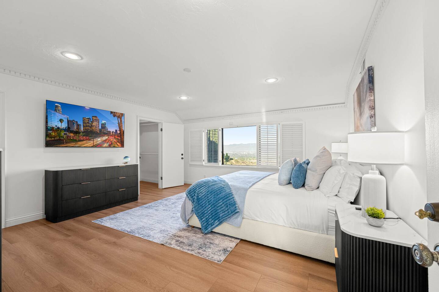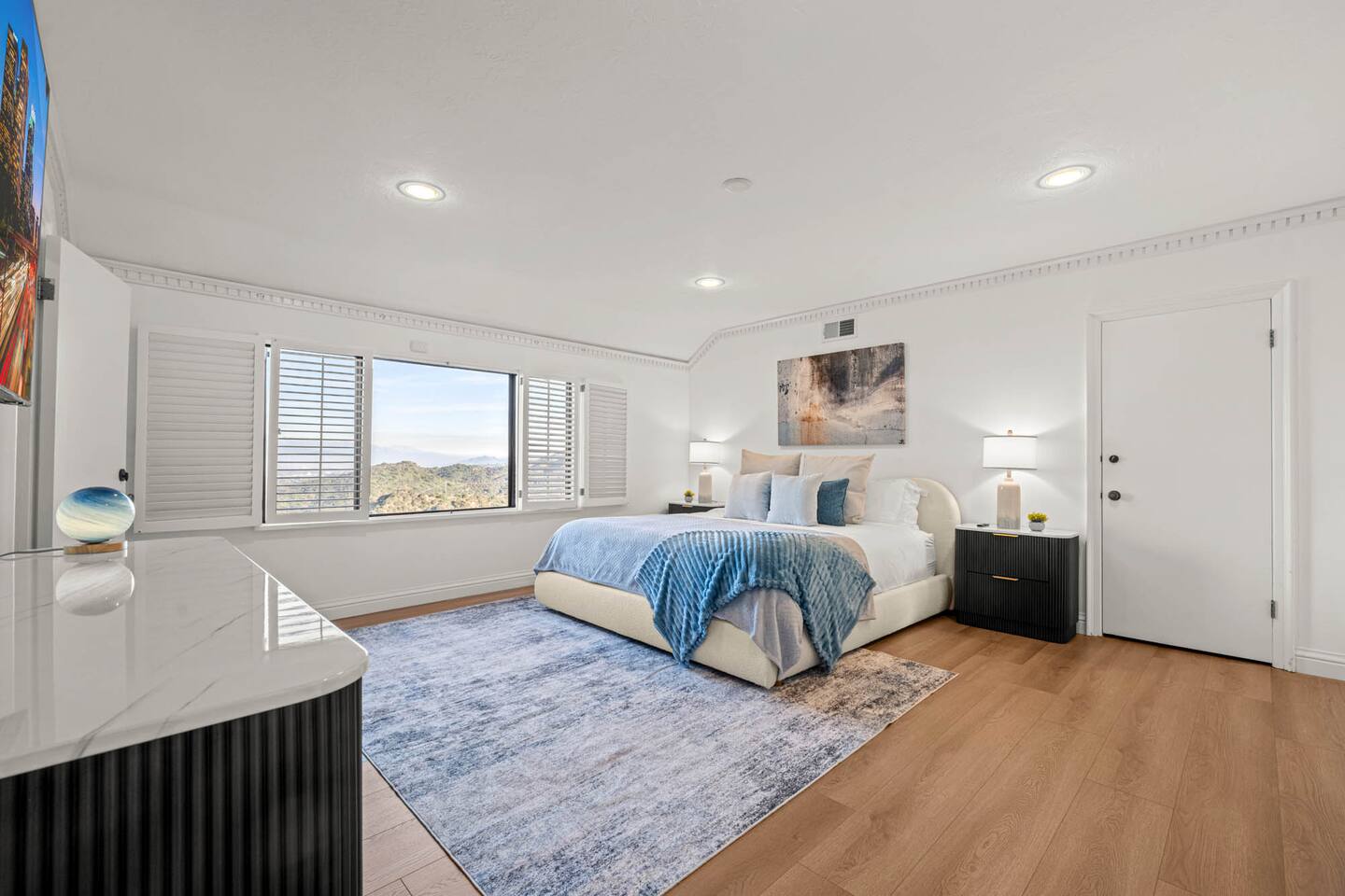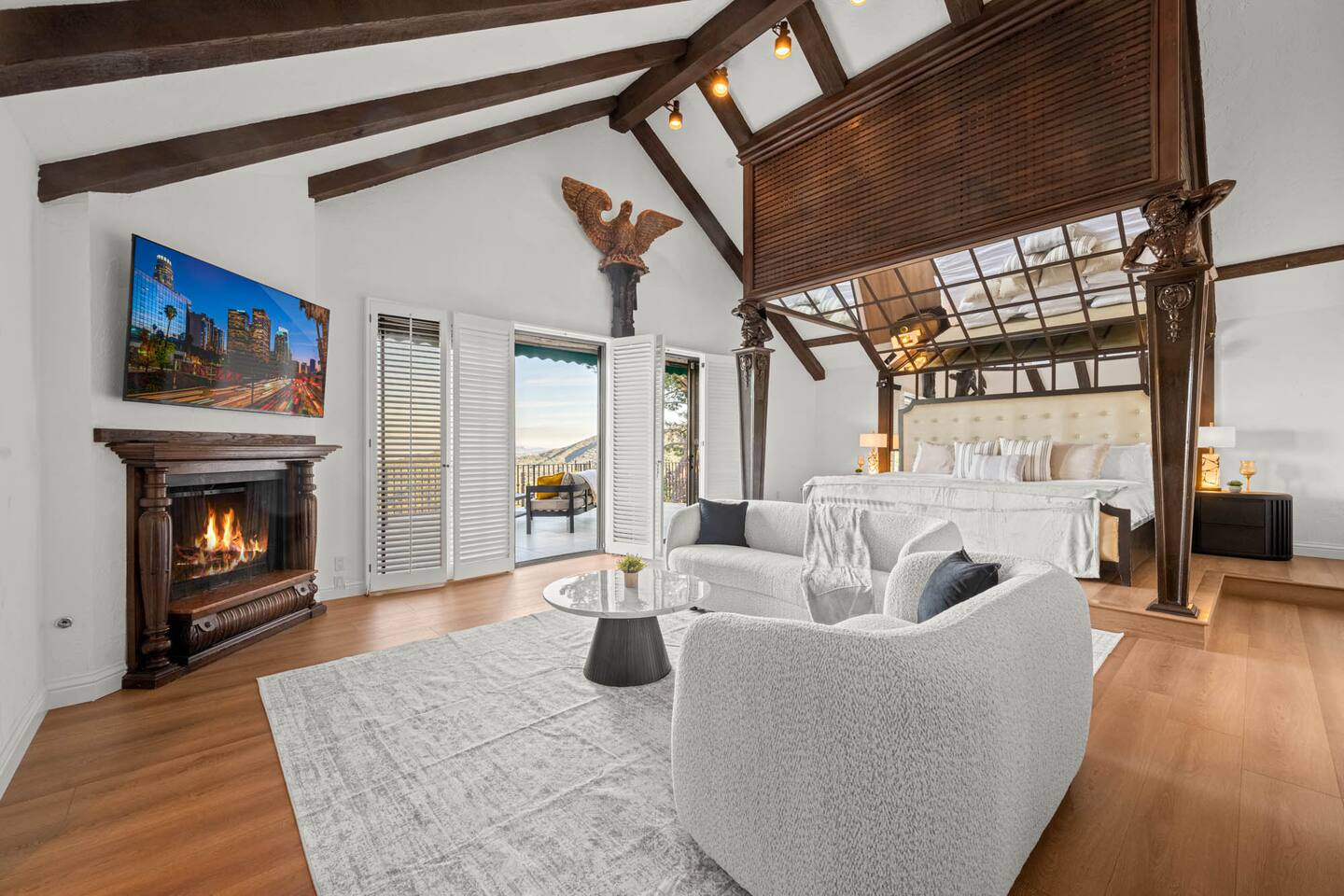 ALE-ready executive home ideal for insurance stays, relocations, and extended visits. This nearly 5,000 sq ft executive home sits at one of the highest points in Encino Hills, offering rare privacy and sweeping lake views. With 4 bedrooms and 4.5 bathrooms, it features a resort-style yard with pool, spa, sauna, and dual bar areas. The primary suite includes an Alaskan king bed and a private patio with outdoor seating overlooking the lake—perfect for sunrise coffee or sunset views.