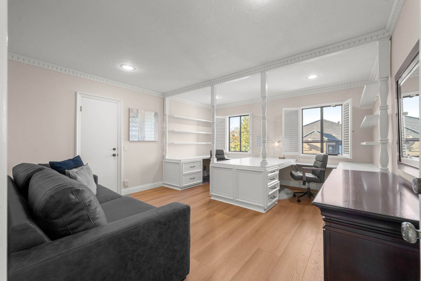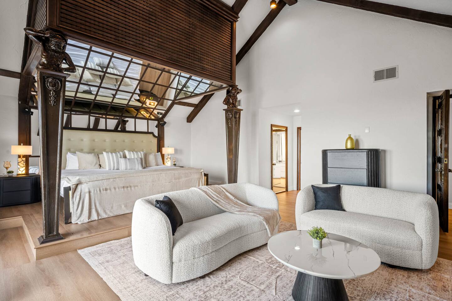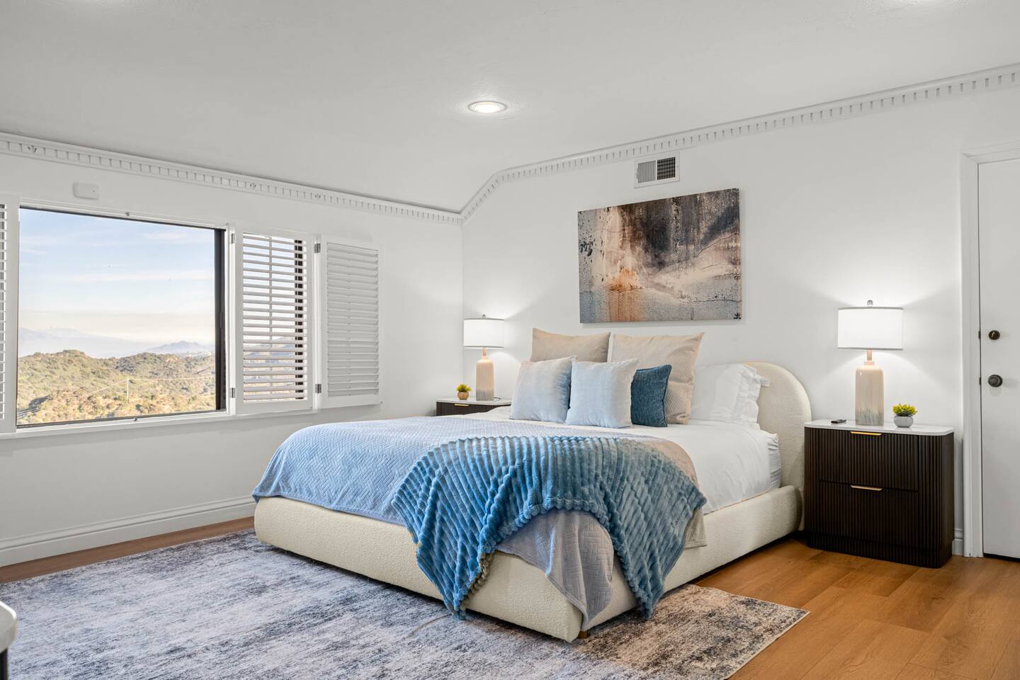 ALE-ready executive home ideal for insurance stays, relocations, and extended visits. This nearly 5,000 sq ft executive home sits at one of the highest points in Encino Hills, offering rare privacy and sweeping lake views. With 4 bedrooms and 4.5 bathrooms, it features a resort-style yard with pool, spa, sauna, and dual bar areas. The primary suite includes an Alaskan king bed and a private patio with outdoor seating overlooking the lake—perfect for sunrise coffee or sunset views.