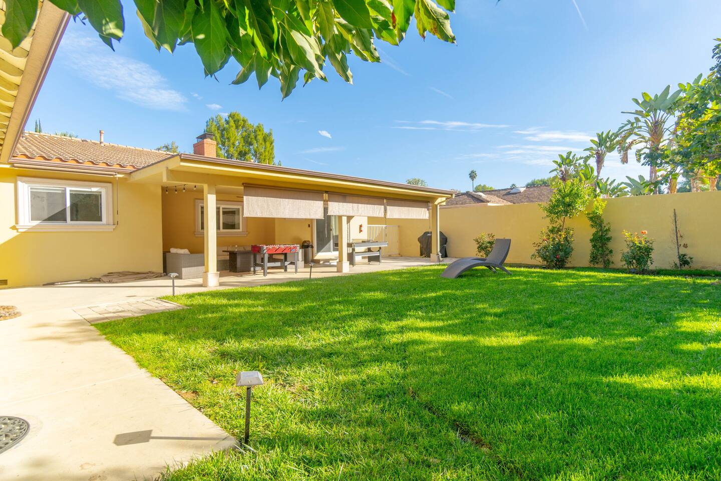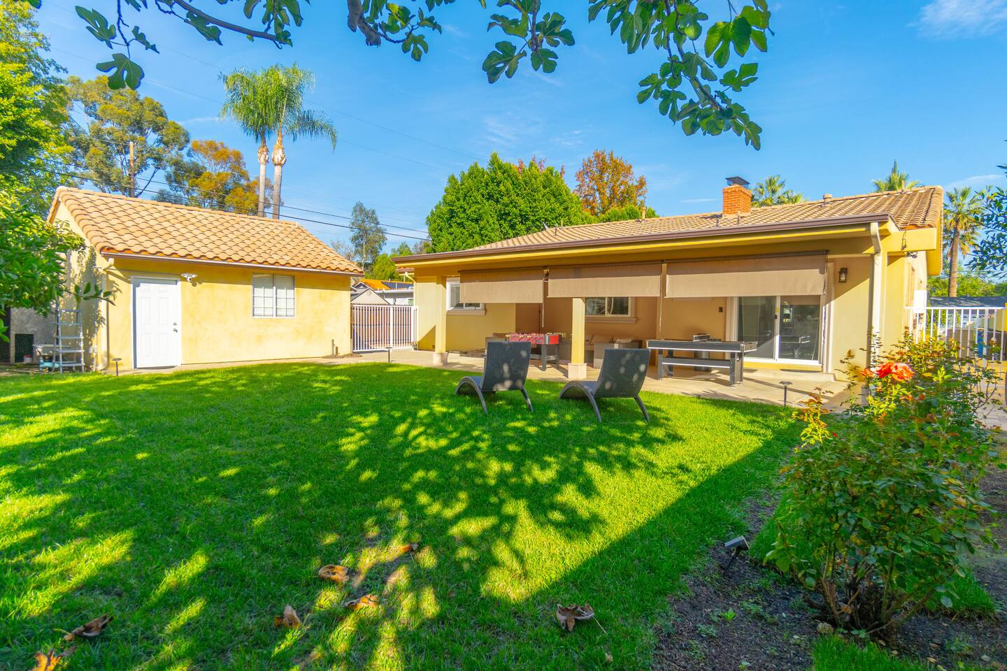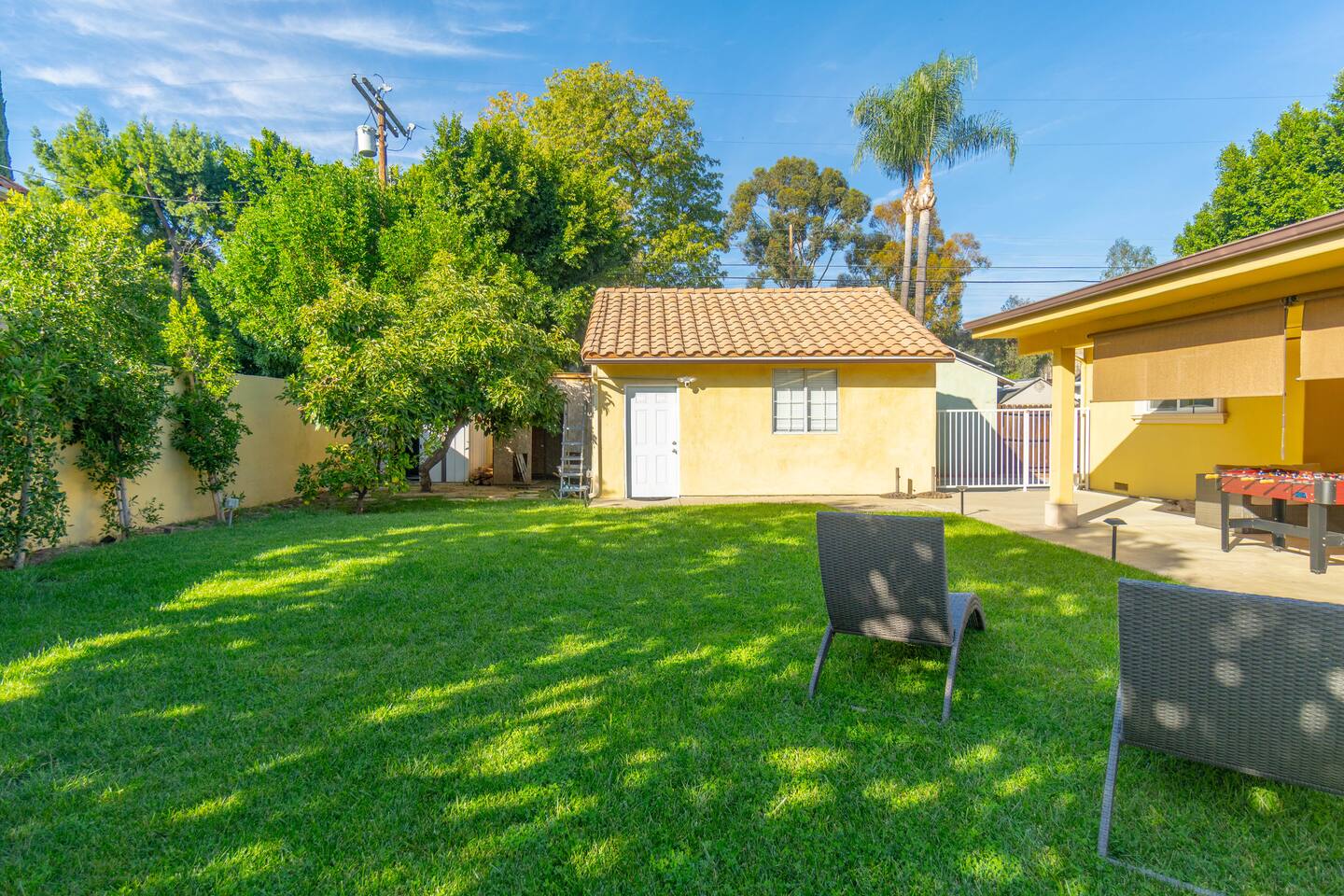 As you approach the residence, a grand circle drive welcomes you, providing convenient access and adding to the elegant curb appeal. The lush landscaping surrounding the property creates a tranquil atmosphere, inviting you to unwind and relax in style. Step inside to discover a spacious interior featuring three bedrooms and three bathrooms, each thoughtfully designed with your comfort in mind. The living spaces are adorned with luxurious amenities and tasteful decor, seamlessly blending sophistication with warmth. For those seeking entertainment, a billiard table and foosball table awaits, promising hours of friendly competition and enjoyment. A covered patio beckons with its wicker seating arrangement, ideal for al fresco dining or simply unwinding with a good book. One of the property's most delightful features is the orange tree, allowing guests to indulge in freshly picked fruit during their stay. Imagine starting your day with a glass of freshly squeezed orange juice, savoring the flavors of the Mediterranean right in your own backyard. Whether you're seeking a peaceful retreat or a luxurious getaway, this Mediterranean home offers the perfect escape. With its upscale amenities, lush surroundings, and inviting atmosphere, it's a haven where every moment is infused with comfort and elegance.