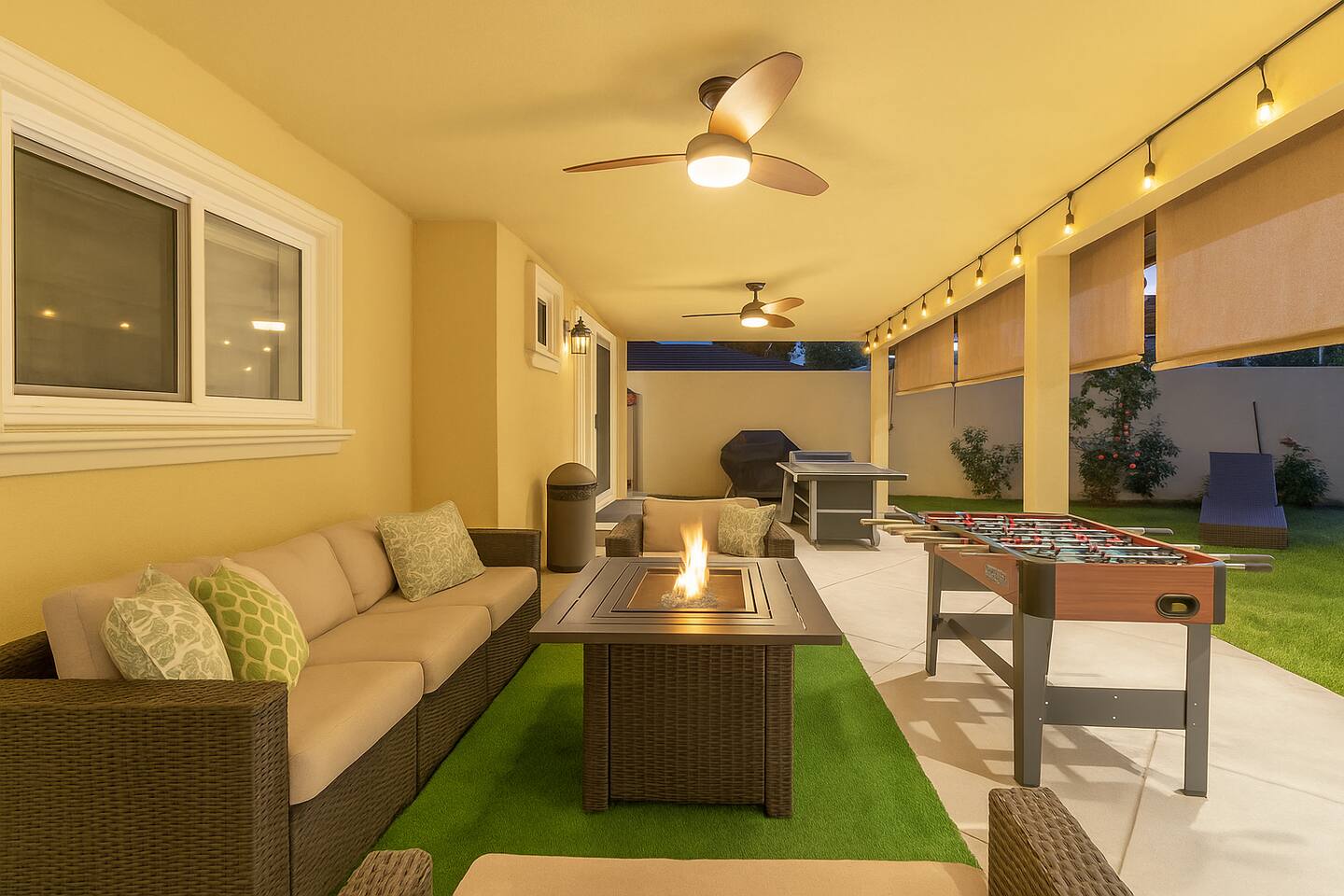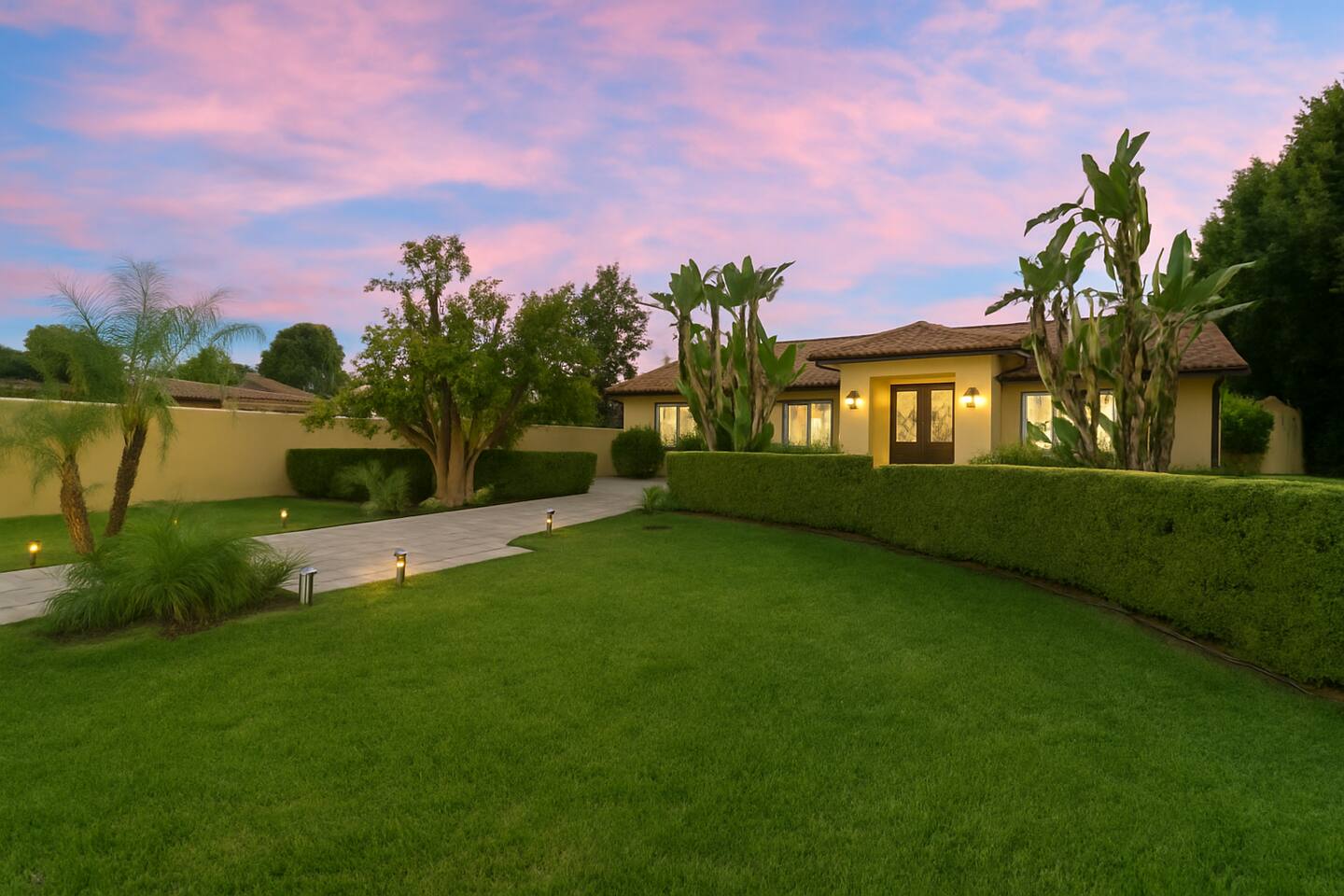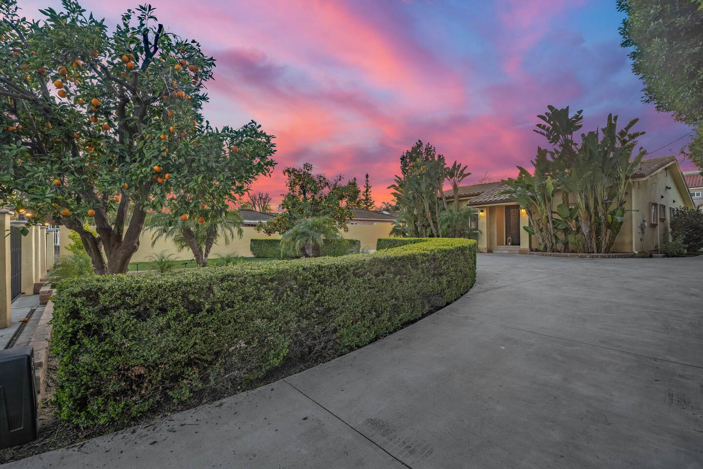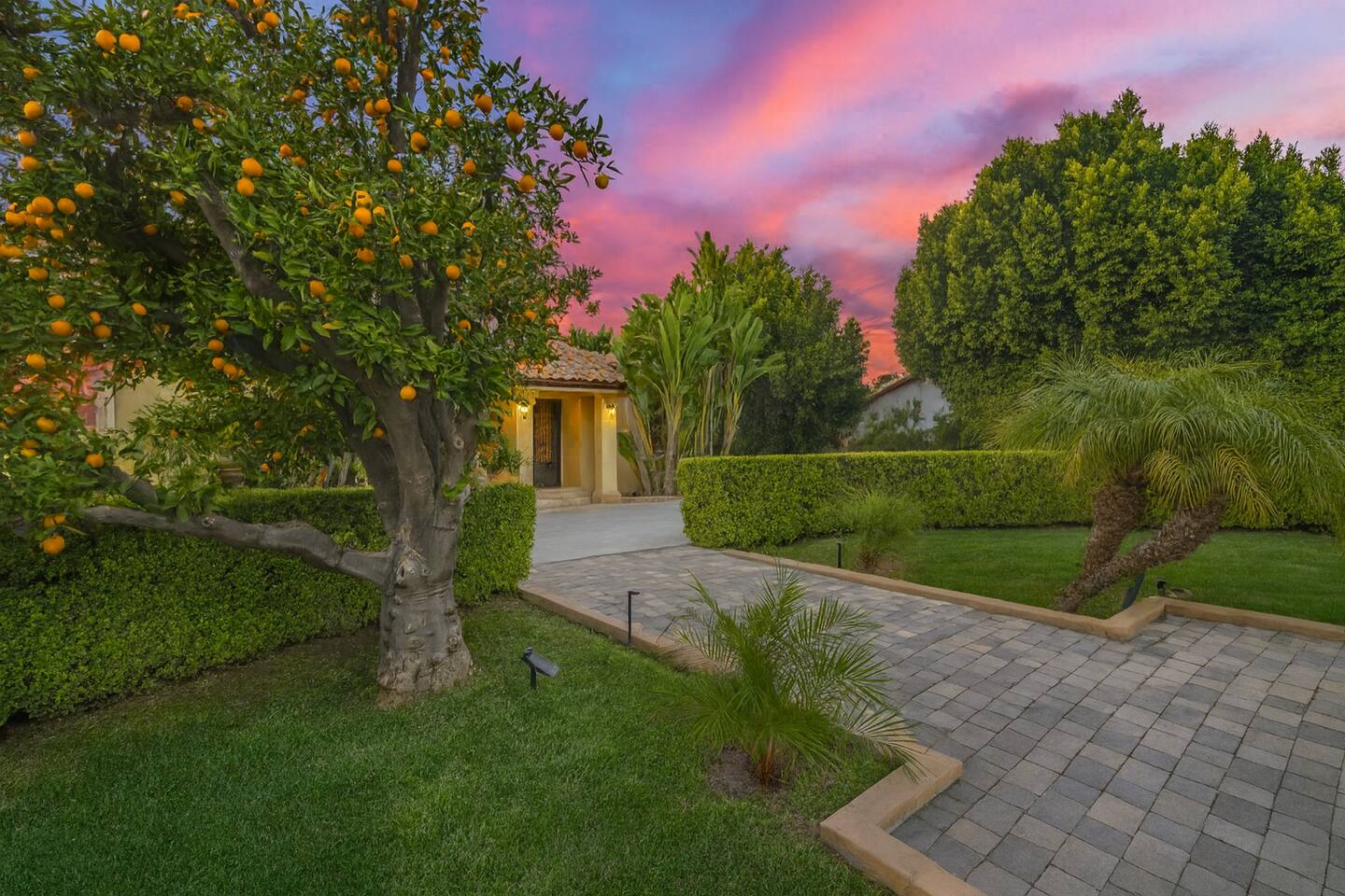 As you approach the residence, a grand circle drive welcomes you, providing convenient access and adding to the elegant curb appeal. The lush landscaping surrounding the property creates a tranquil atmosphere, inviting you to unwind and relax in style. Step inside to discover a spacious interior featuring three bedrooms and three bathrooms, each thoughtfully designed with your comfort in mind. The living spaces are adorned with luxurious amenities and tasteful decor, seamlessly blending sophistication with warmth. For those seeking entertainment, a billiard table and foosball table awaits, promising hours of friendly competition and enjoyment. A covered patio beckons with its wicker seating arrangement, ideal for al fresco dining or simply unwinding with a good book. One of the property's most delightful features is the orange tree, allowing guests to indulge in freshly picked fruit during their stay. Imagine starting your day with a glass of freshly squeezed orange juice, savoring the flavors of the Mediterranean right in your own backyard. Whether you're seeking a peaceful retreat or a luxurious getaway, this Mediterranean home offers the perfect escape. With its upscale amenities, lush surroundings, and inviting atmosphere, it's a haven where every moment is infused with comfort and elegance.