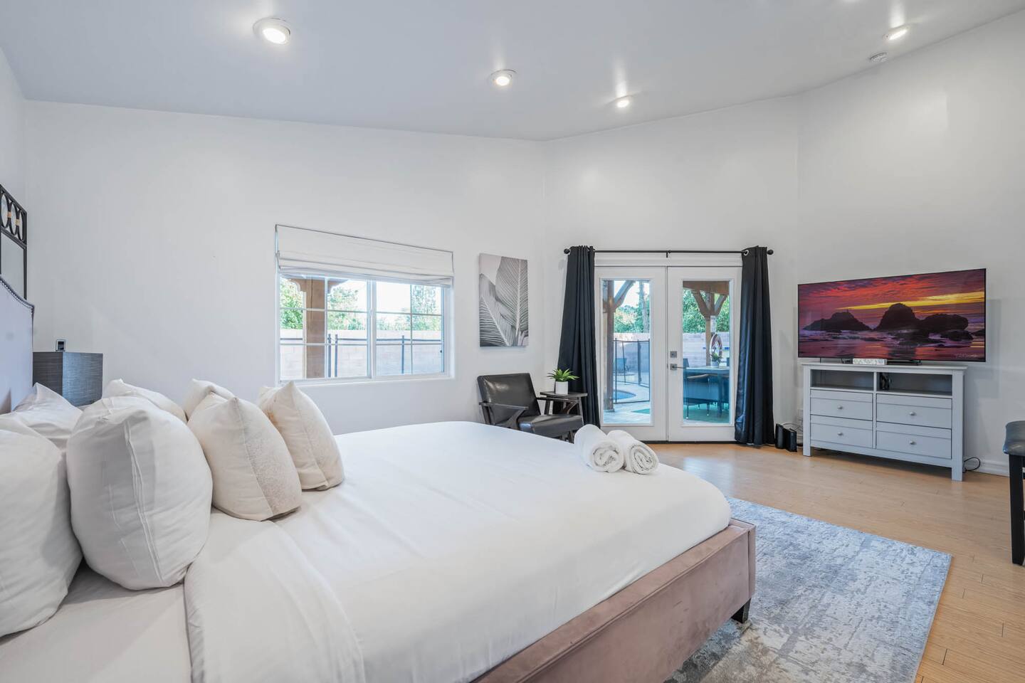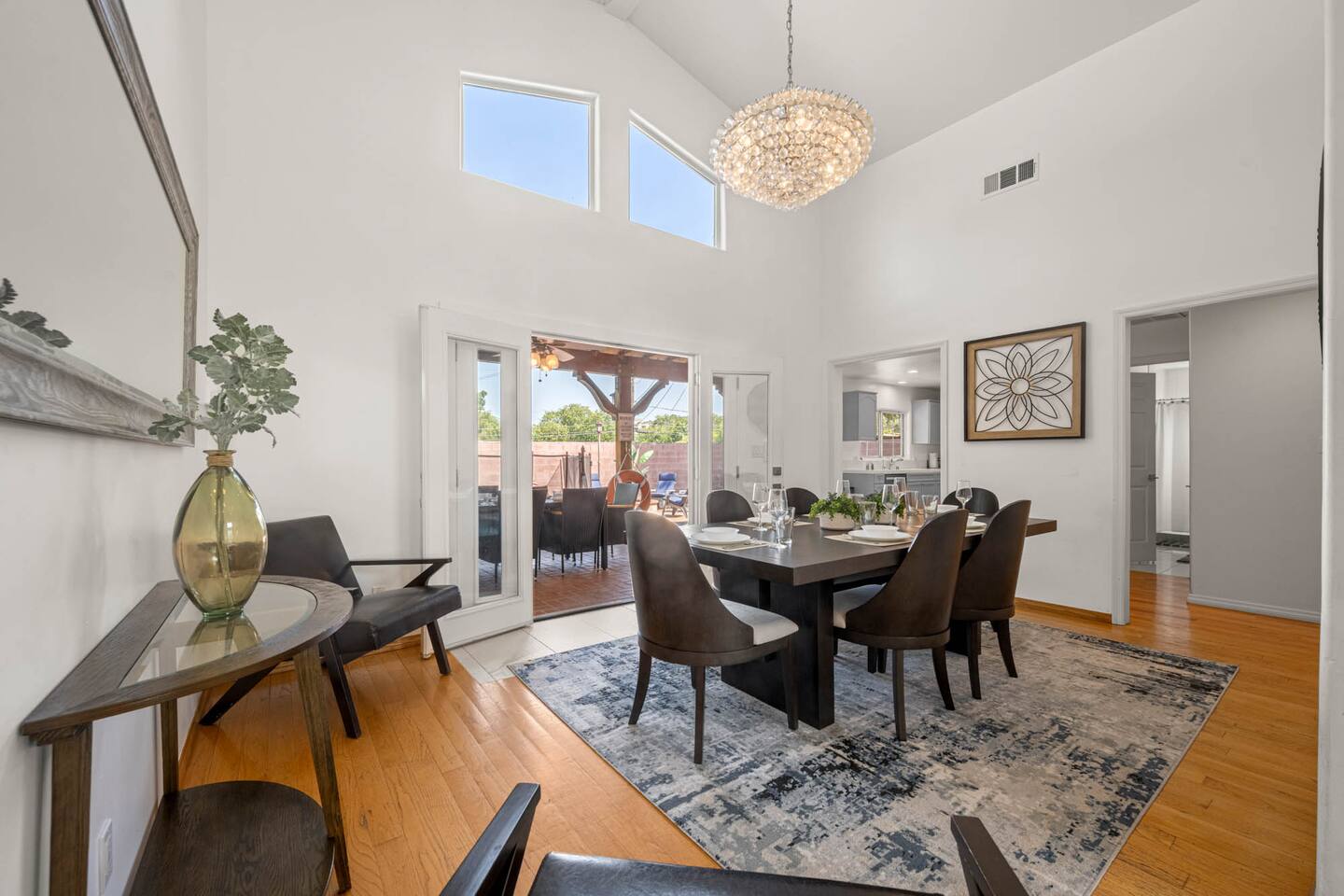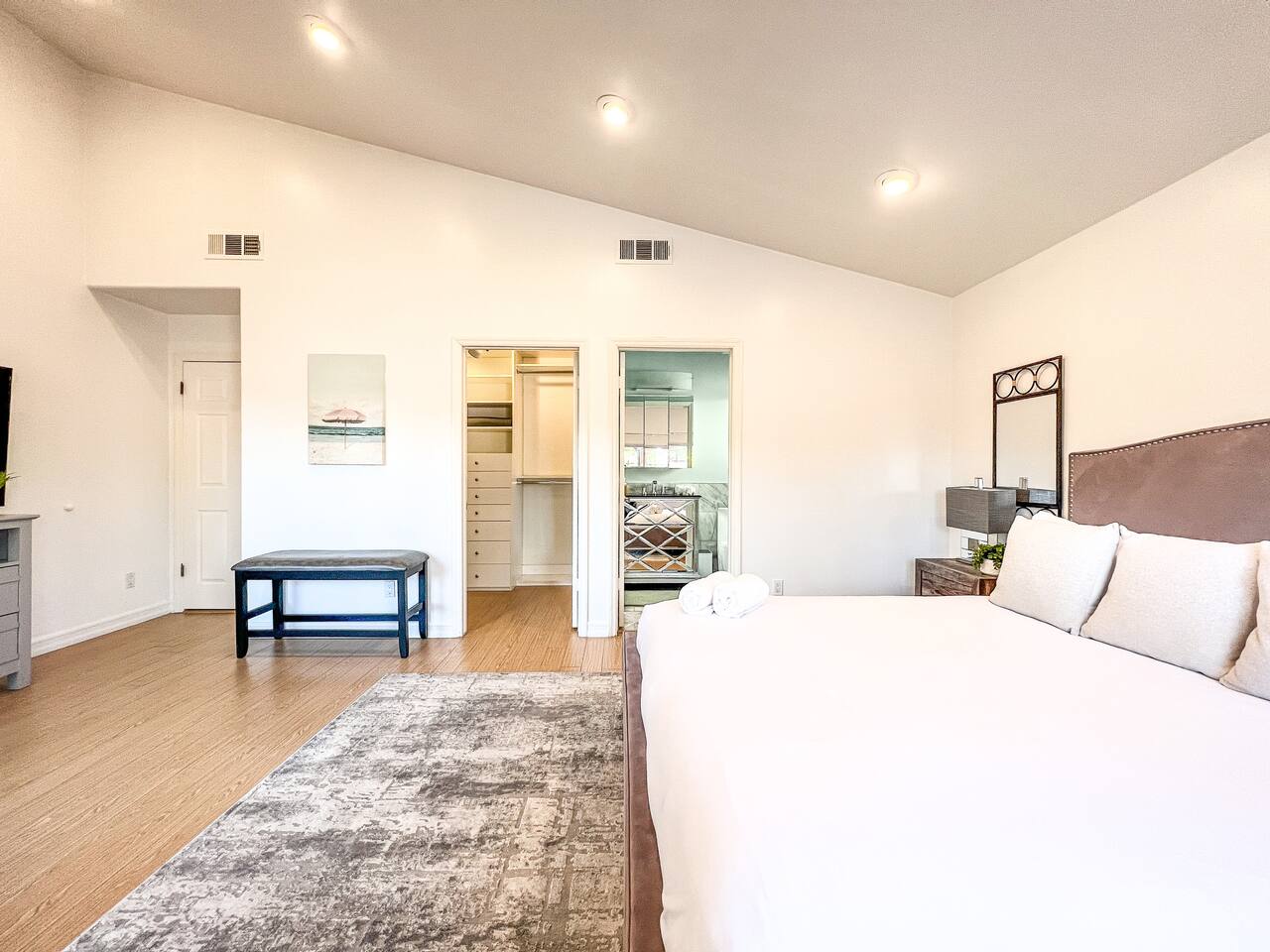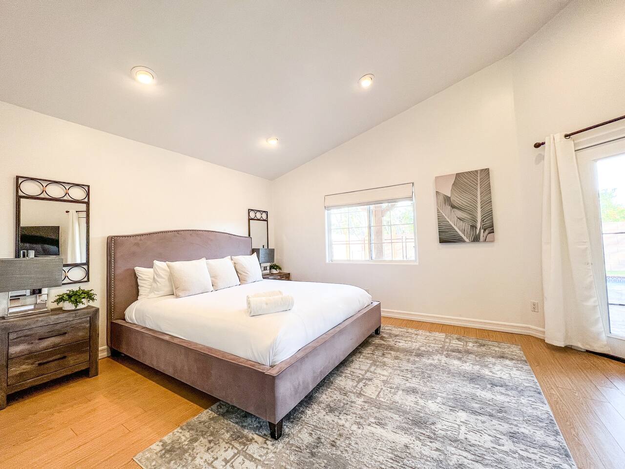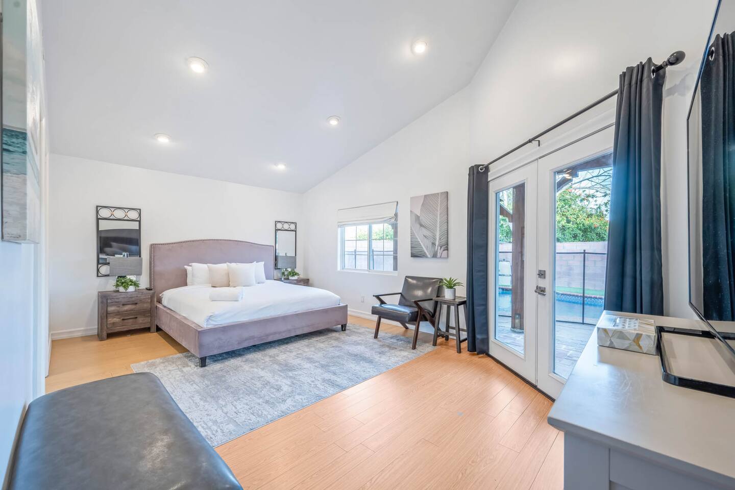Step inside to soaring vaulted ceilings, abundant natural light, and brand-new living and dining room furniture that create a fresh, welcoming atmosphere. The home features two luxurious primary suites, each with king beds and remodeled en-suite bathrooms, offering comfort and privacy for families or groups traveling together. Outside, enjoy a sparkling heated pool and spa, perfect for relaxing or entertaining under the California sun. Fire up the BBQ grill for al fresco dining and unwind in the beautifully maintained outdoor space. Every detail has been thoughtfully designed for your comfort - from the stunning bathrooms to the pristine cleanliness throughout. Whether you're here for business or leisure, this stylish and happy space is the perfect Tarzana getaway. Offers both driveway and street parking for added convenience.